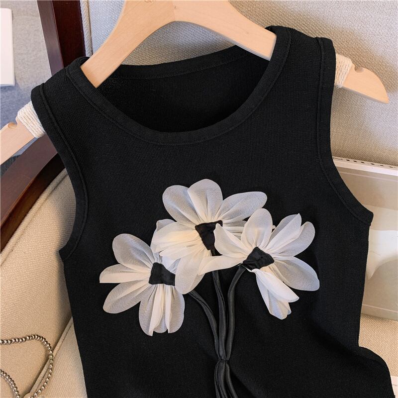 2024 黒 Tシャツシック 3D 花ノースリーブチュニック Tシャツ Ropa クロップドトップス巾着 Y2k Tシャツ ブラック 花柄