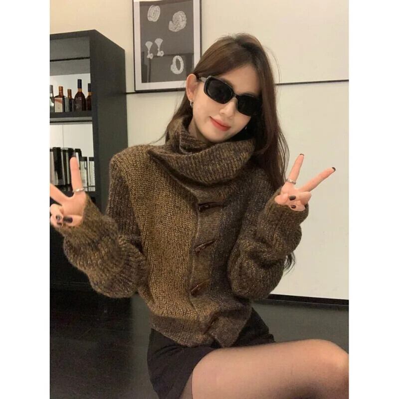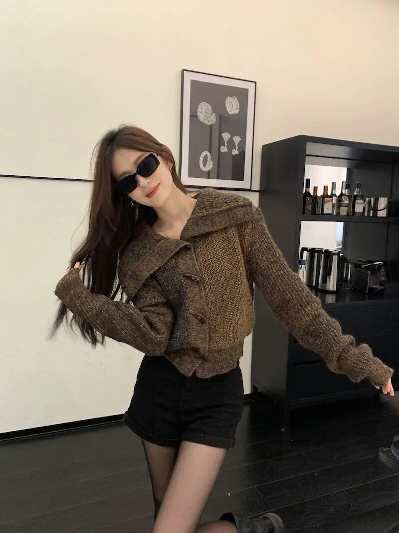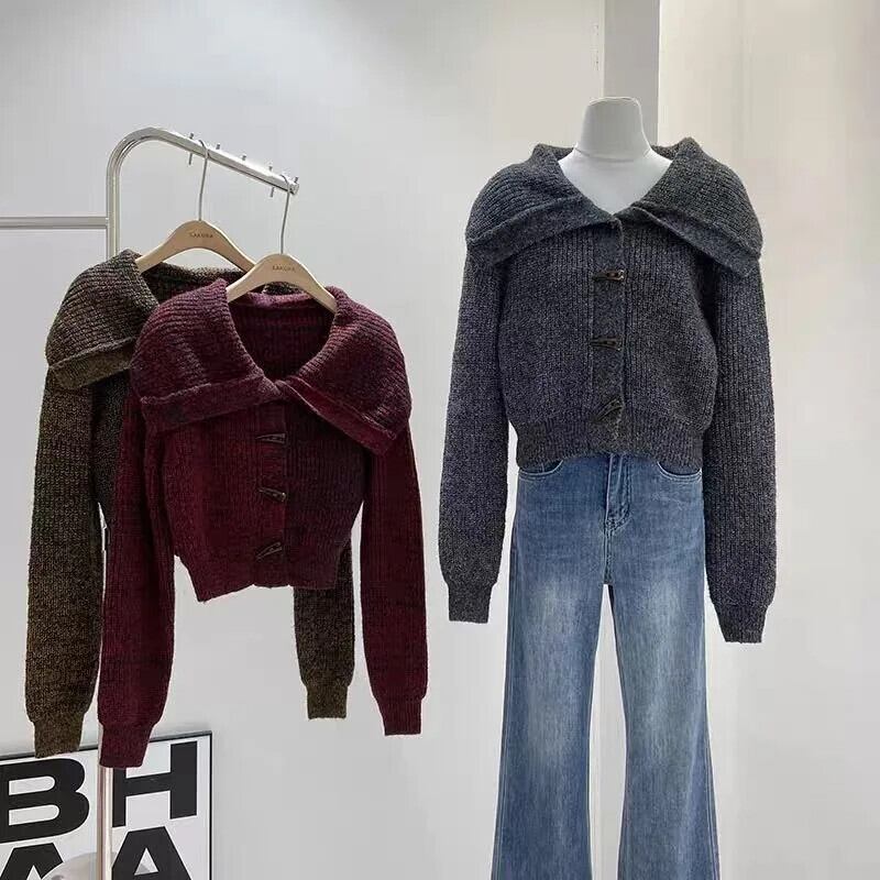 ルーズショートネックニットセーター肥厚怠惰スタイル牛角バックル大きラペルセーターカーディガンジャケットプル
