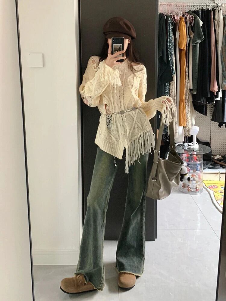 2024 ルーズ怠惰セーター秋プルオーバー O ネックオフショルダースリム Y2k トップホール電話原宿レディース かわいい オータム 秋物 Oネック