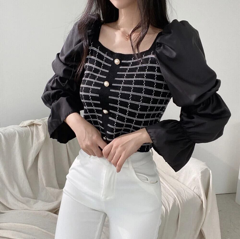スリム 2024 シャツスクエアネックパールバックルチェック柄ニットパッチワークフレアスリーブショートシャツトップスブラウス レッド 真珠 スクウェア