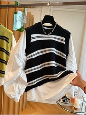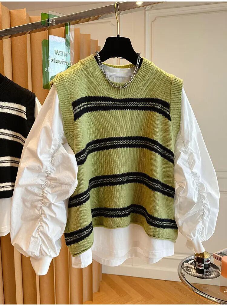 特大セーター Y2k チャレコストライプベストパフスリーブトップスプリーツシャツ白人形ブラウス 2 セット ホワイト 2セット