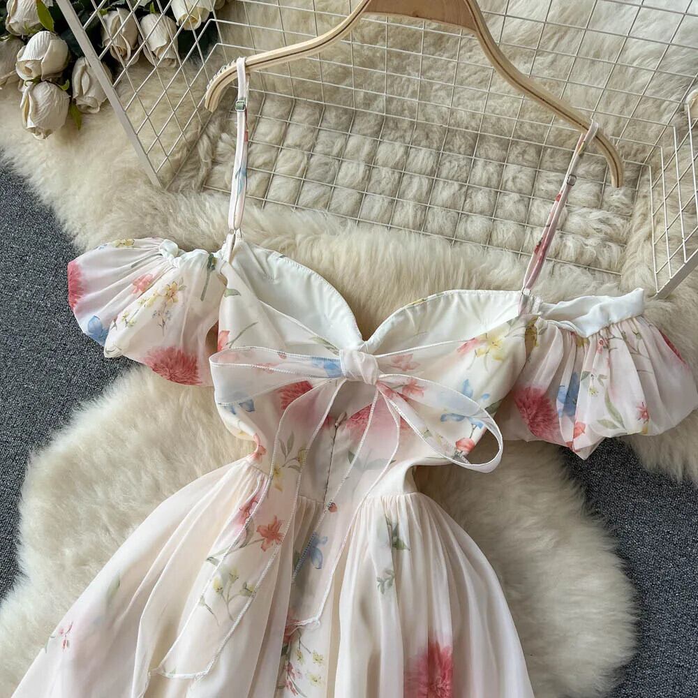 オフショルダーセクシーストラップドレス夏ストラップレスコルセットマキシサンドレス背中開いた弓甘いプリントロングドレス 2024 Vestidos リボン 大人ガーリー スウィート キュート カジュアル サマー 夏物
