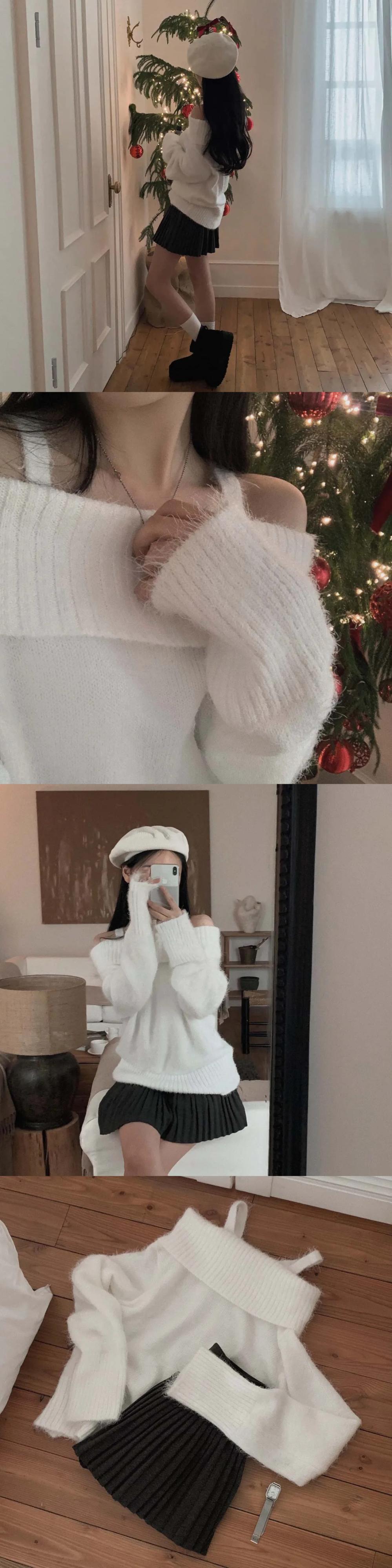 ミンクカシミヤ気質ワンネックオフショルダールーズ長袖白ニットセーターセーターデブラックトップス2024 ロング ホワイト