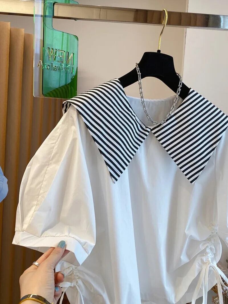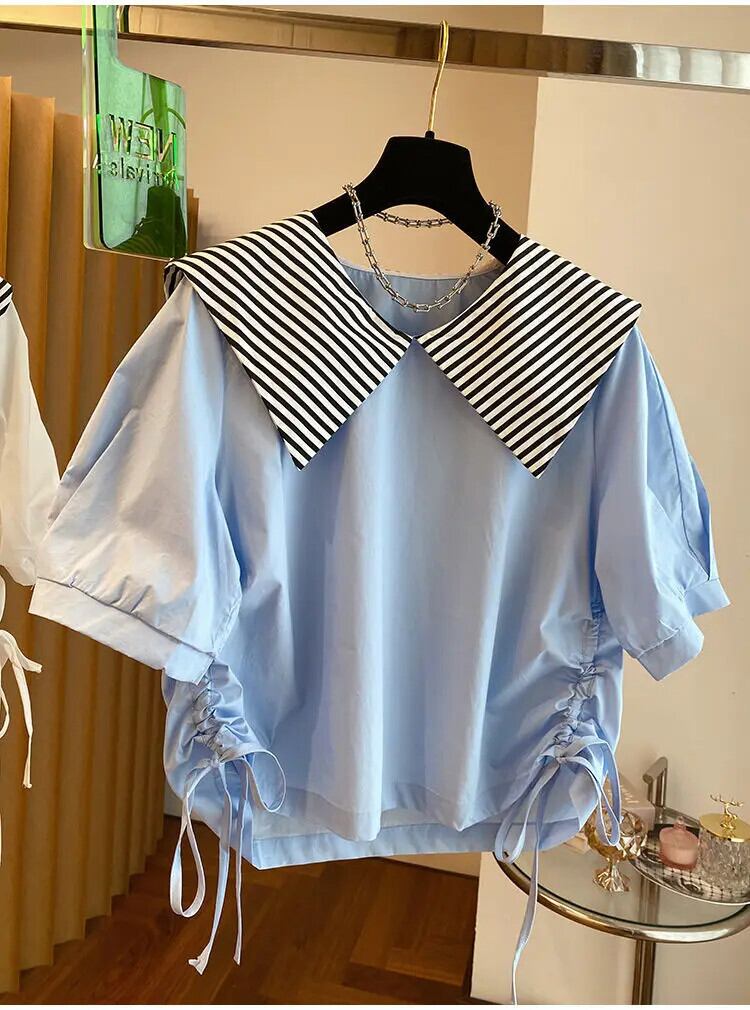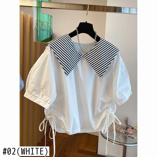 2024 夏ストライプラペル巾着シャツショートドールクロップトップ原宿グラフィック Tシャツグランジ Tシャツネイビー かわいい サマー 夏物