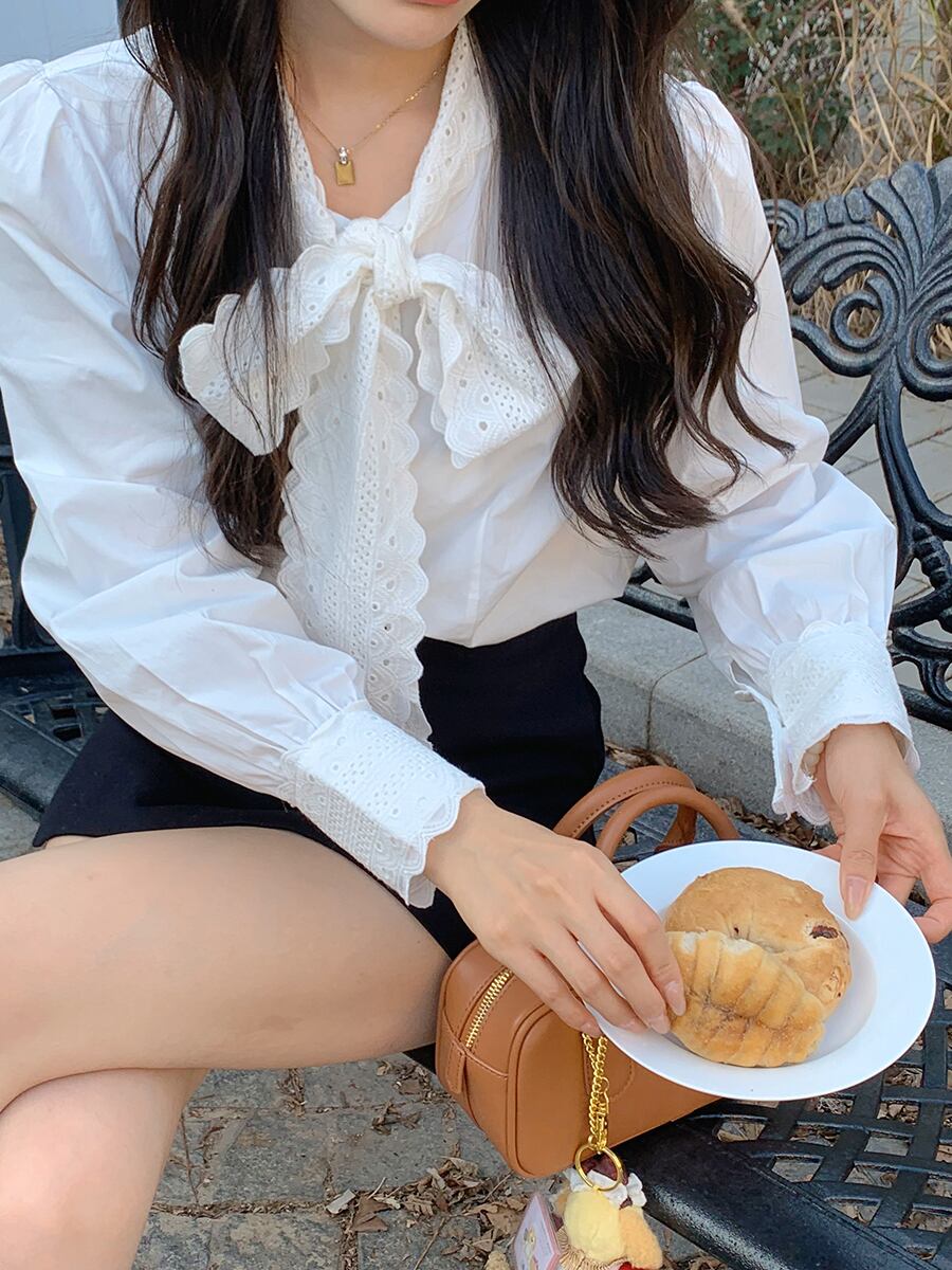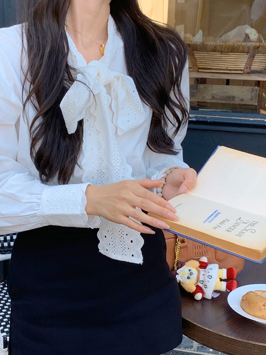 s es フレンチボウレースパッチワーク白シャツ気質スリムシャツブラウストップス 2024 ホワイト リボン
