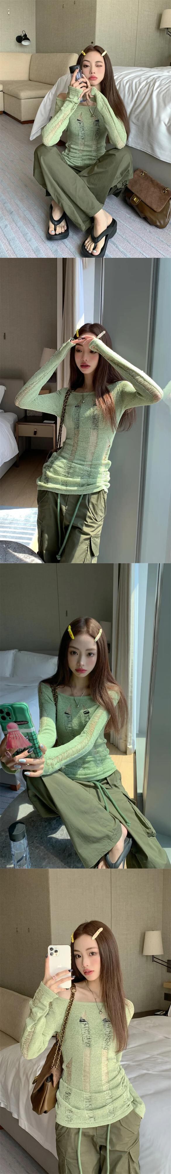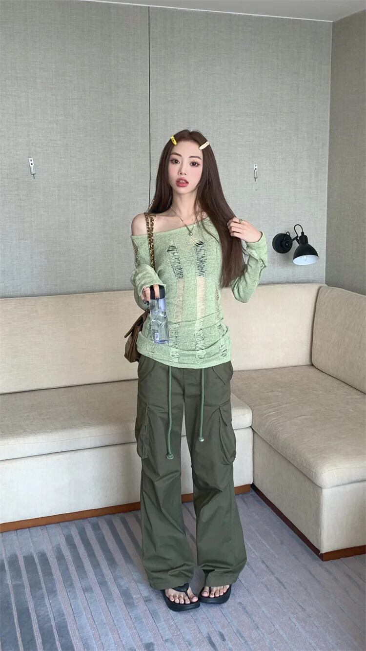 視点グリーン袖オフショルダーミッドレングスニットセーター Y2k シンプルホットスイート薄穴シャツセーター 大人ガーリー スウィート キュート カジュアル