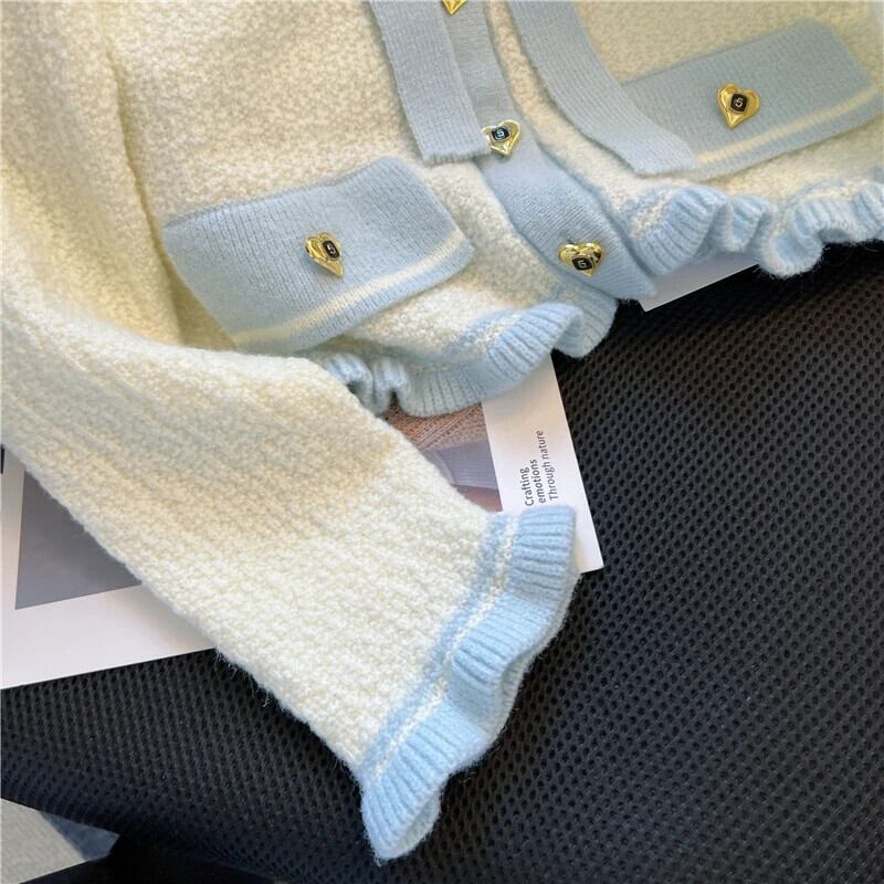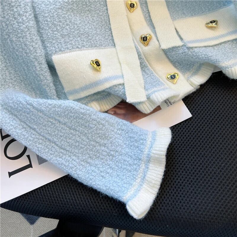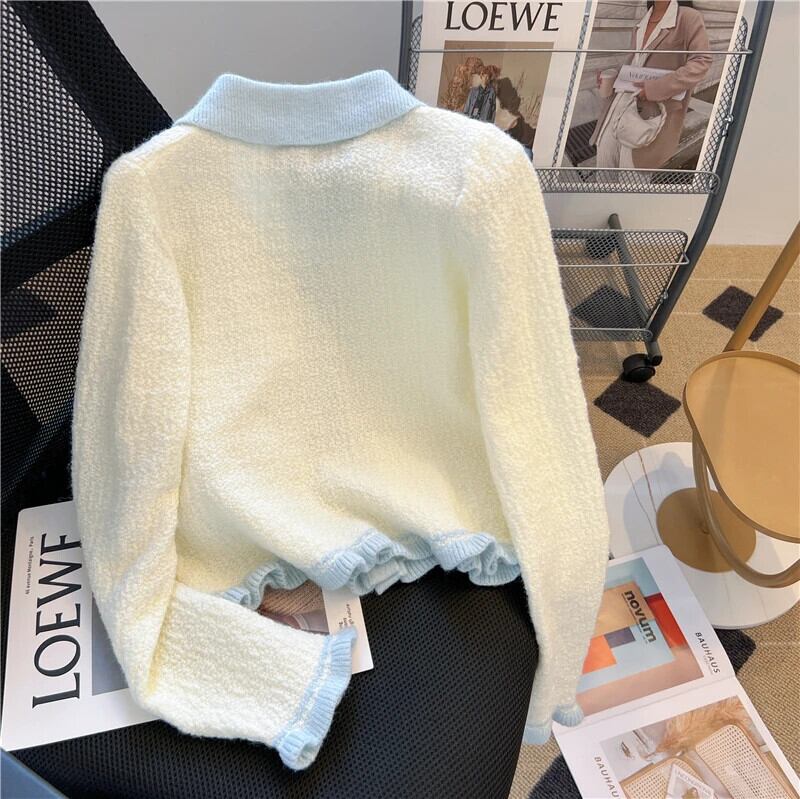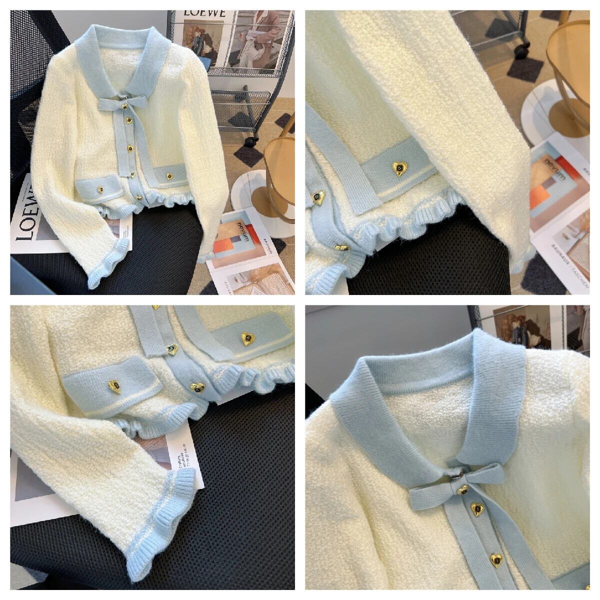 木製耳エッジカラーコントラストちょう結びセーターカーディガン秋 2024 小さ香り長袖トップス ロング リボン オータム 秋物