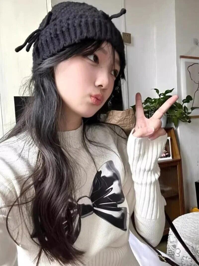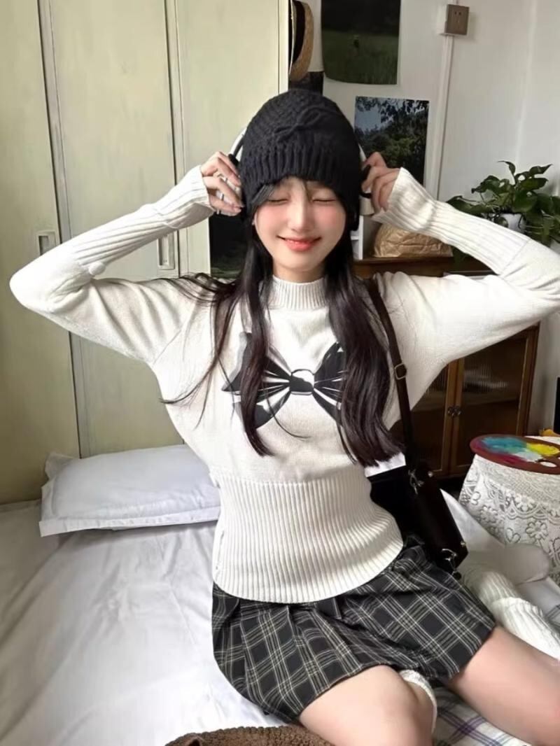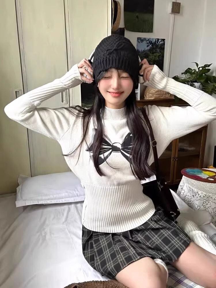 白弓グラフィックセーター半襟長袖ニットスキニーY2k美学秋冬2024 ロング ホワイト リボン オータム 秋物 ウィンター 冬物
