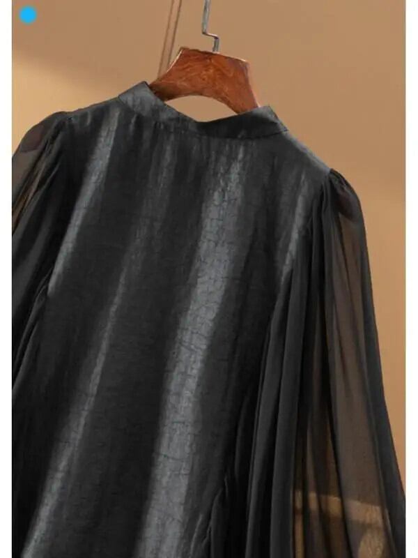 黒バットスリーブシャツ Y2k ストリートブラウス 2024 秋プリーツシフォントップススタイルシック ブラック オータム 秋物
