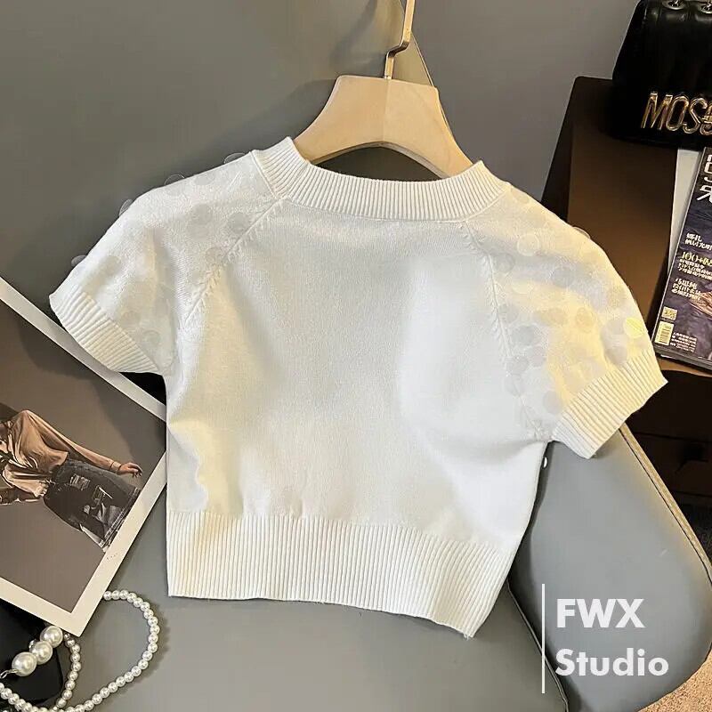 重工業スパンコール半袖ニットセーター原宿グラフィック Tシャツクロップトップ 2024 夏 Y2k Tシャツ黒 ショート ブラック ハーフスリーブ かわいい サマー 夏物