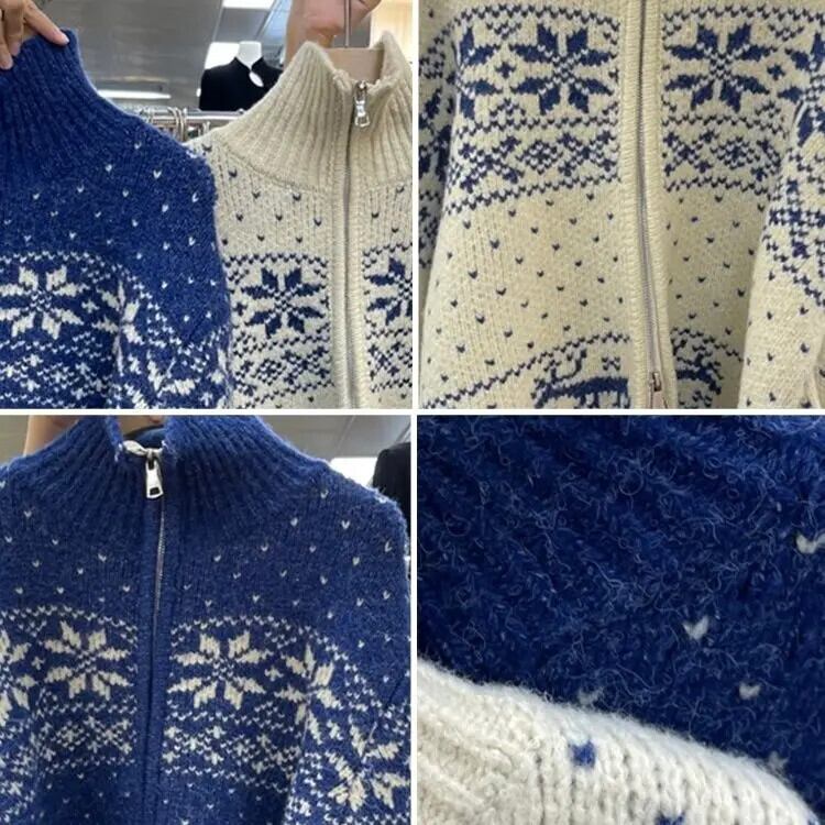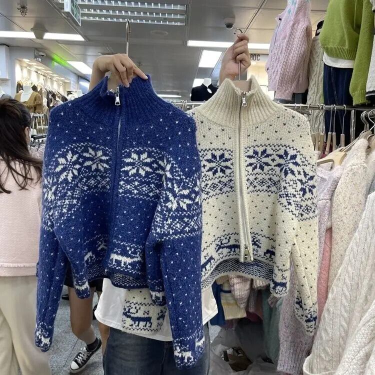 クリスマスセータージッパー特大カーディガンスタイル長袖トップ2024ニットジャケットジャカードハーフネック ロング