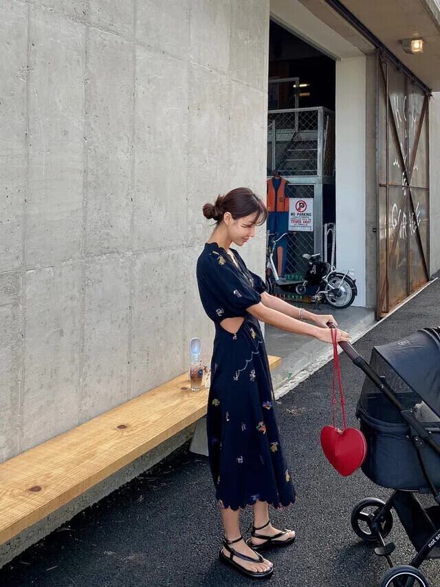 夏ロング刺繍フラワーシフォンドレスアウトウエスト V ネックミディサンドレススタイル 2024 サマー 夏物 Vネック フラワーデザイン