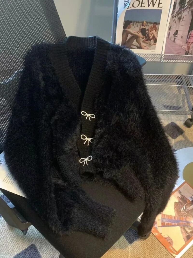 模造ミンクニットクロップトップ春秋ソフトカーディガンスリムピンクセーター弓 Knitewear コート リボン スプリング 春物