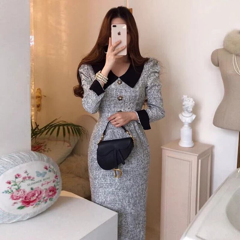秋ラペル襟シックボタンコントラスト香り良いチェック柄ドレスローブスリム A ライン Vestidos De es オータム 秋物 Aライン