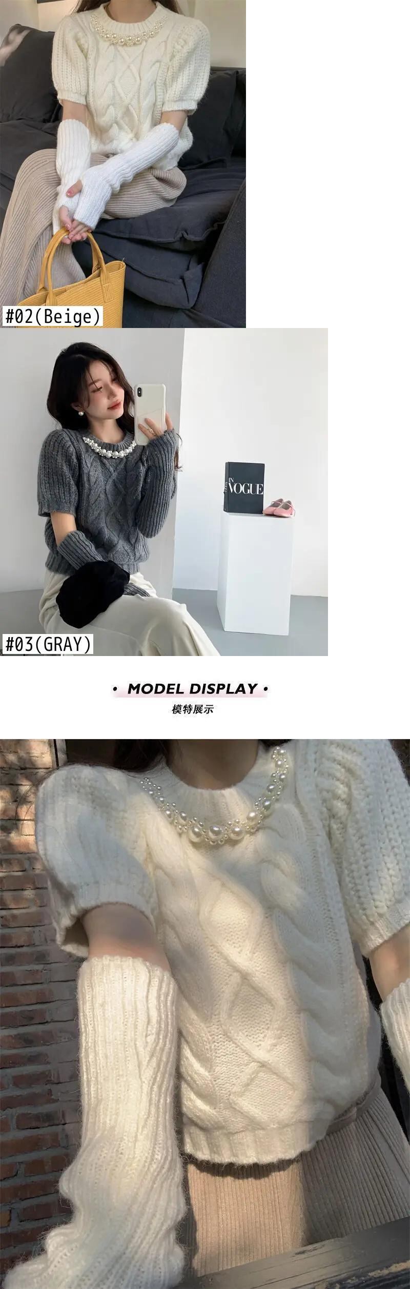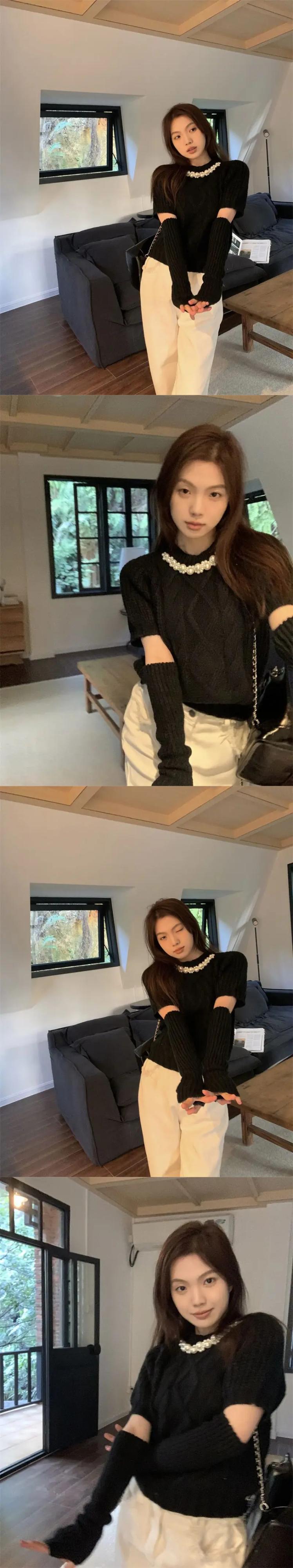 黒ラウンドネックバブル半袖セーターセーターニットツイストジャージプルオーバー Y2k 2024 秋セータートップ ショート ブラック ハーフスリーブ オータム 秋物 Oネック