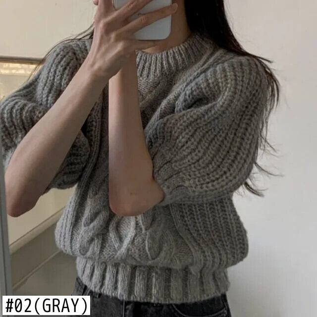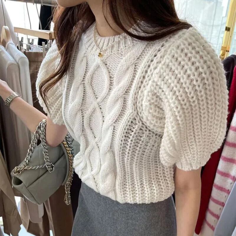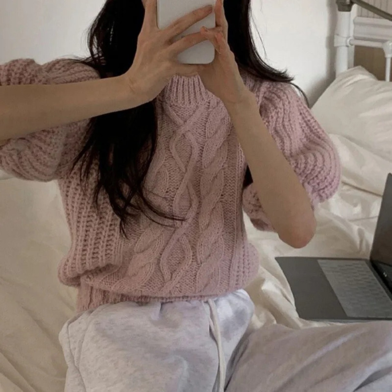 パフスリーブセーター O ネックソリッドカラーニットプルオーバートップス秋 2024 ピンクセーター オータム 秋物 Oネック