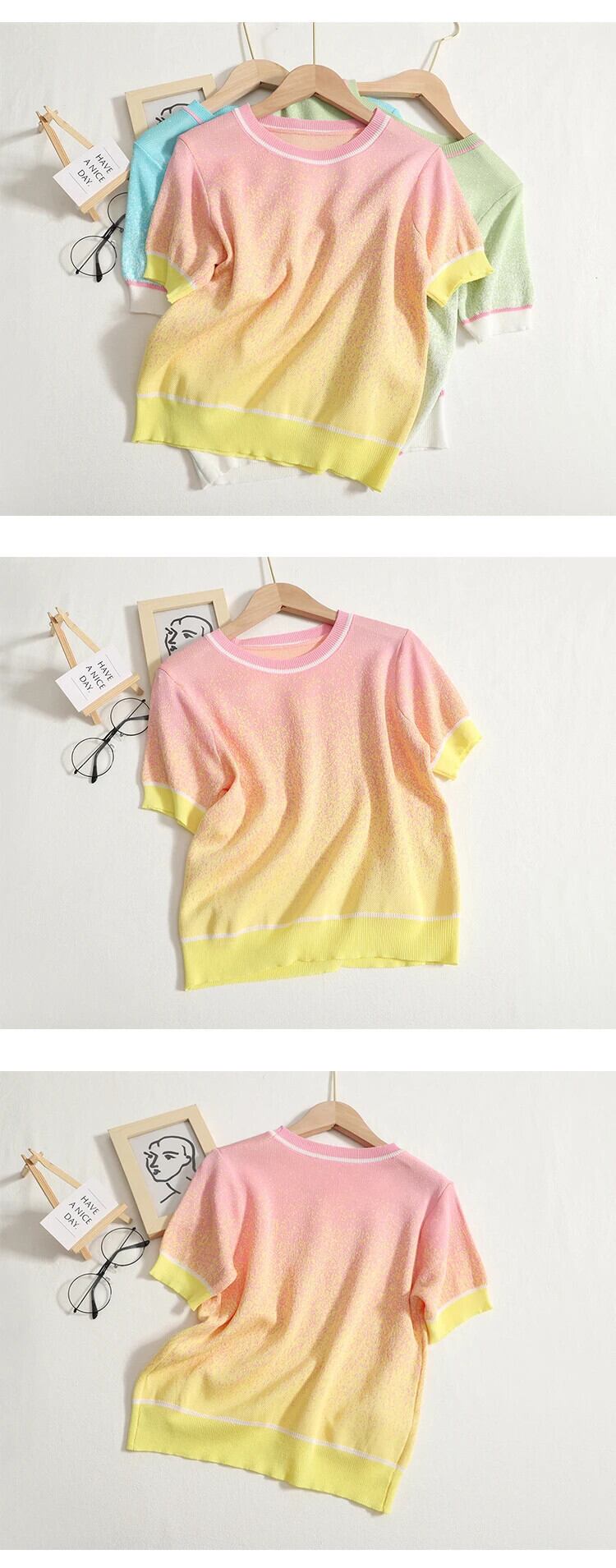 2024 夏 Tシャツトップグラデーションラウンドネックルーズ半袖ニットセーターロパデグラフィック Tシャツ Y2k 作物 ショート ハーフスリーブ サマー 夏物 Oネック