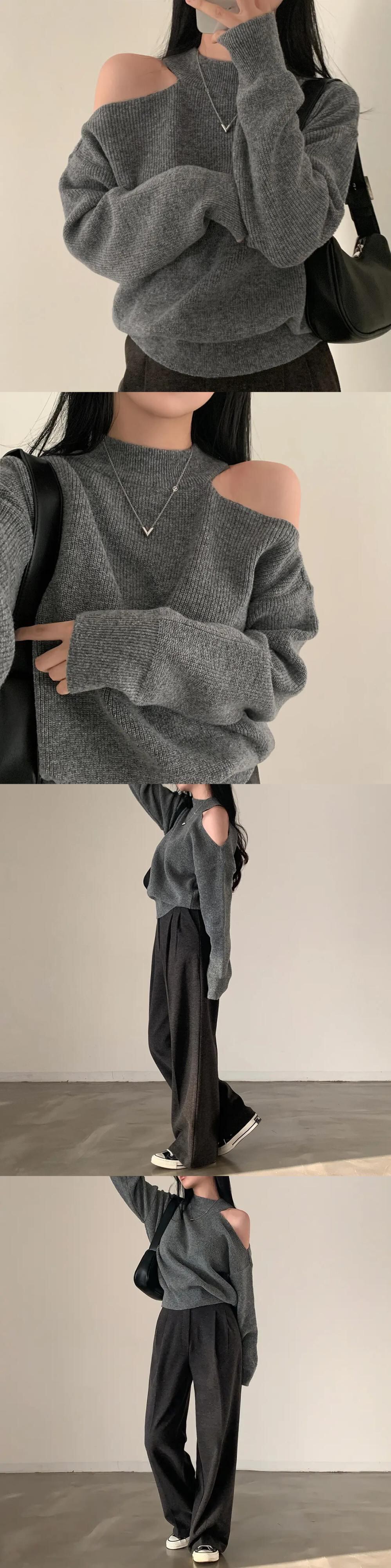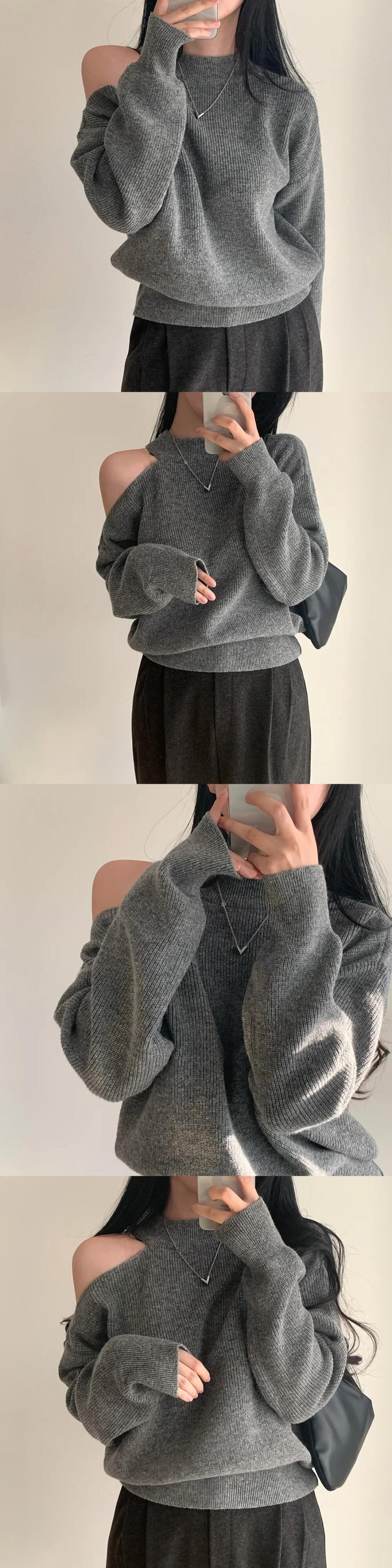 ラウンドネックオフショルダールーズグレーニットセーター冬特大黒ジャンパーセーター ブラック ウィンター 冬物 Oネック