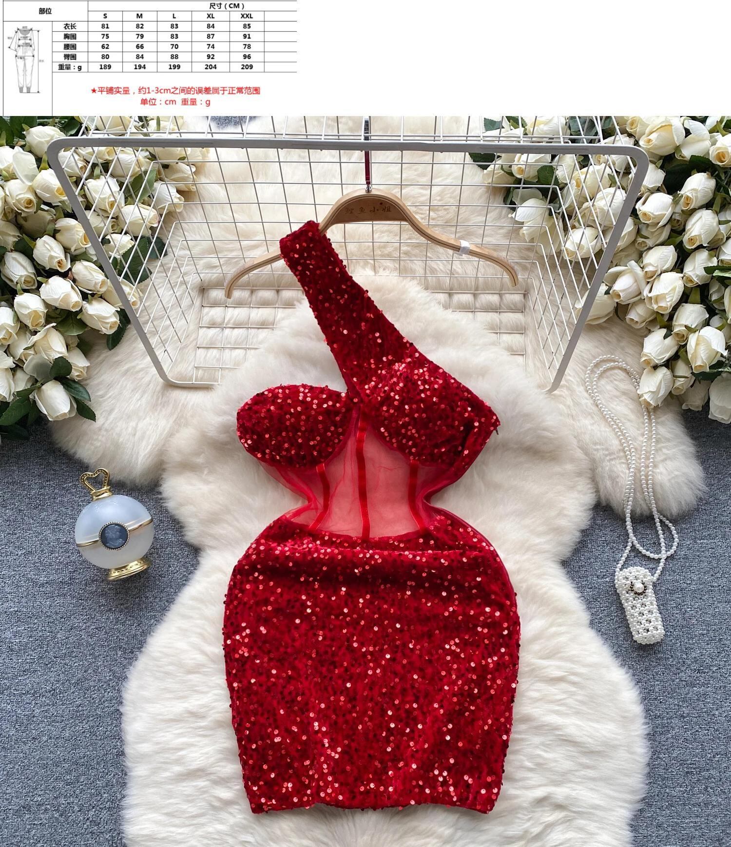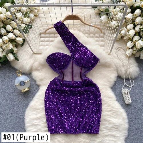 フレンチラグジュアリーセクシーカラフル斜めネックショートスパンコールドレス秋冬イブニングパーティーキラキラミニブリンブリン オータム 秋物 ウィンター 冬物