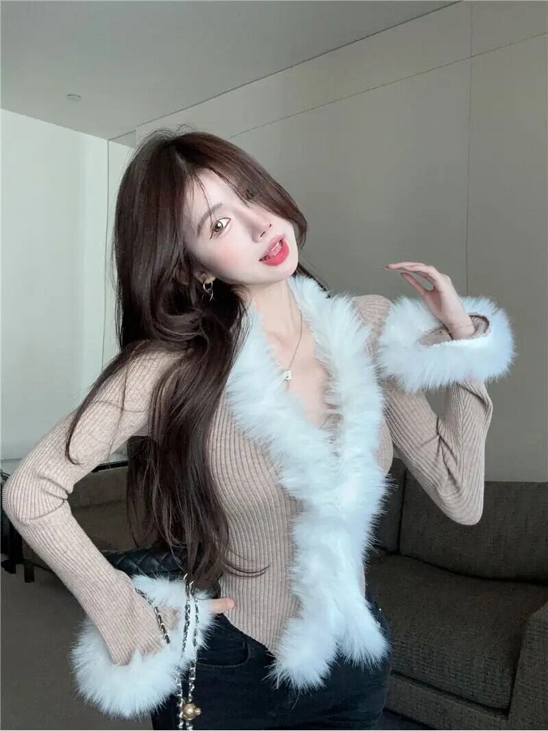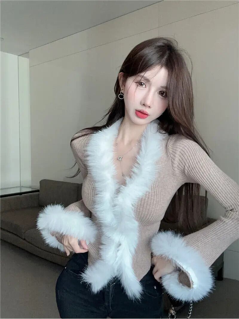 V ネック毛皮セーター 2024 スリム Y2k 丈カーディガンジャケット黒、白羽冬 ホワイト ブラック ウィンター 冬物