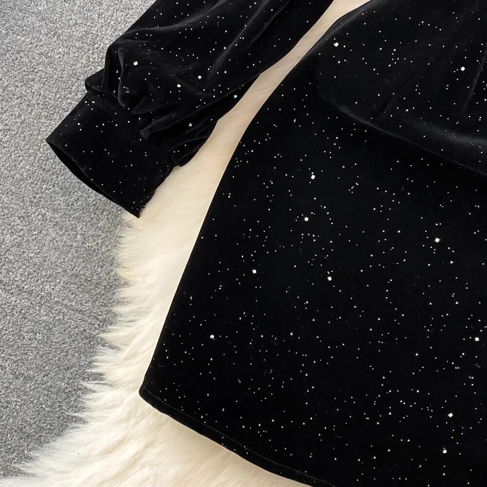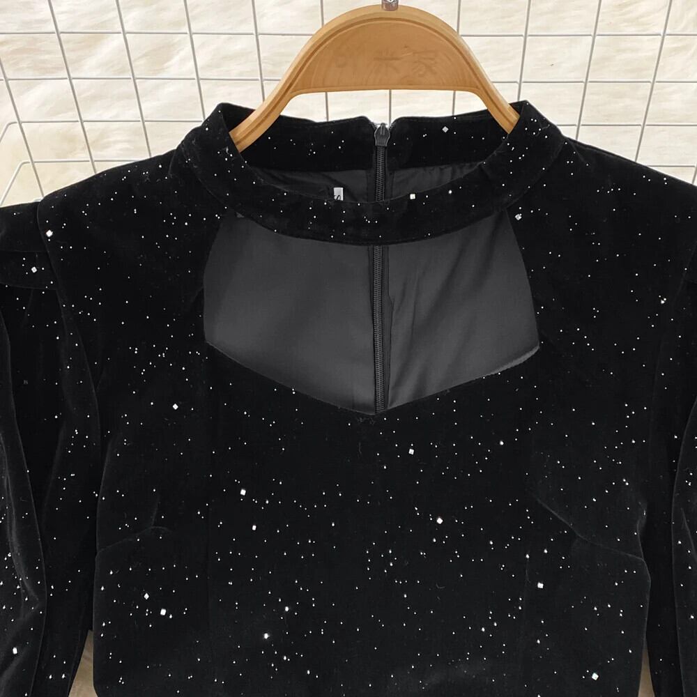 甘いスタイルホルタークリスマススパンコールベルベット長袖ウエスト A ラインドレス 2024 秋ドレスブラック ロング 大人ガーリー スウィート キュート カジュアル オータム 秋物 Aライン