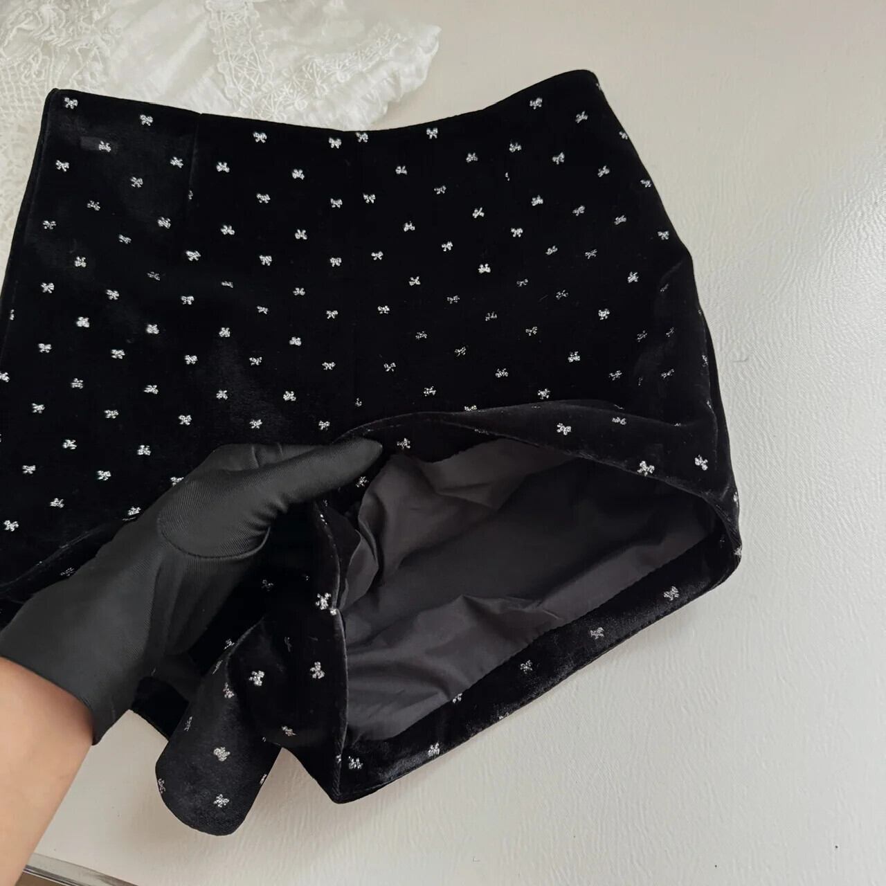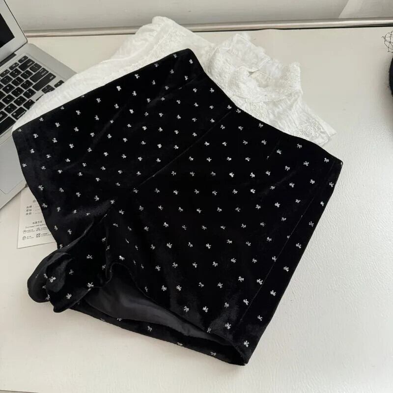 2024 春夏ウエストダイヤモンドショーツストリートワイドレッグビーズ黒ベルベット Y2K 貨物 ブラック スプリング 春物 サマー 夏物 ブルマー ワイドパンツ