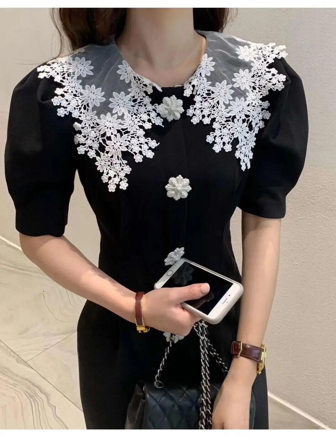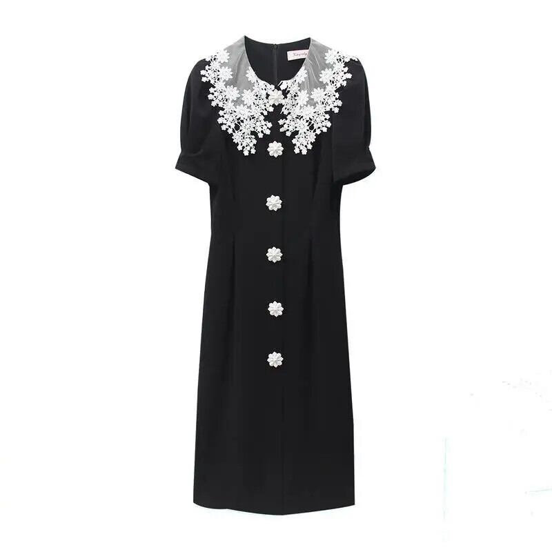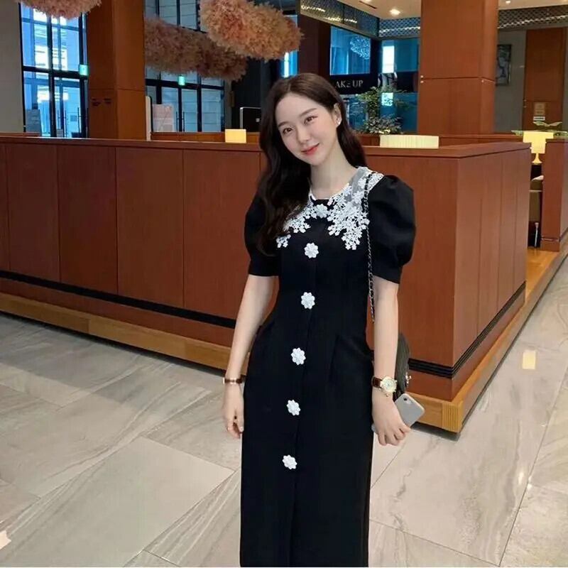 黒バブルスリーブ照合レースドレス夏フレンチウエストロング Vestidos 2024 パーティー Y2k ミディ ブラック サマー 夏物