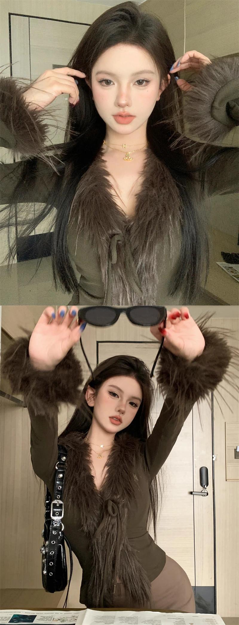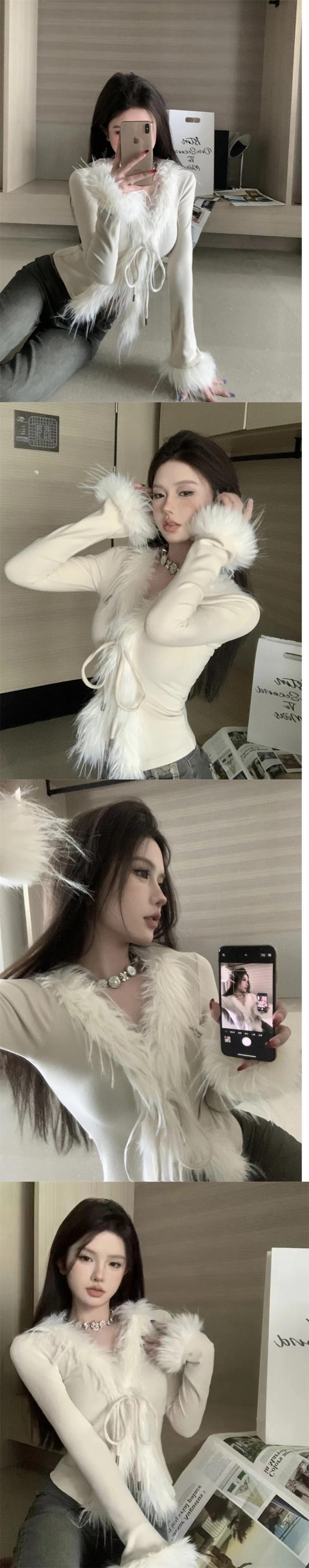 V ネック長袖 Tシャツ包帯セーターファーネッククロップドカーディガンジャケット Y2k ニットセーターデ 2024 ロング