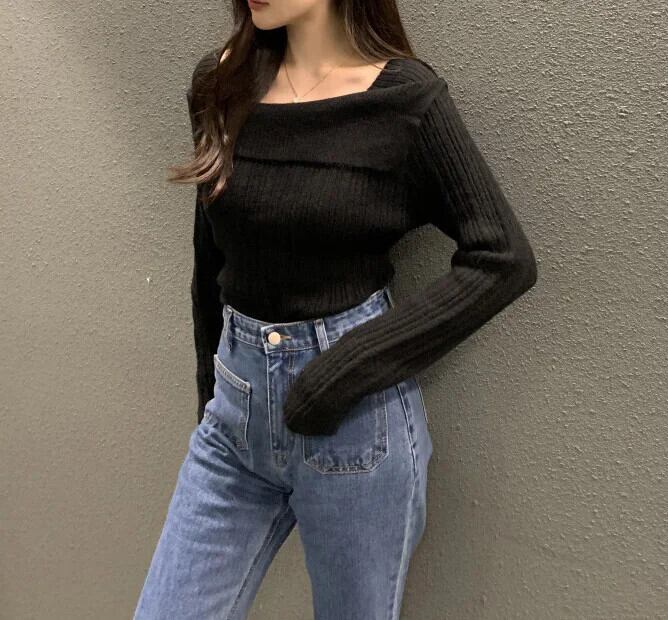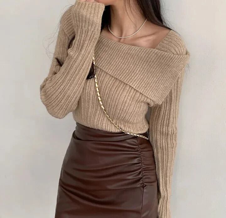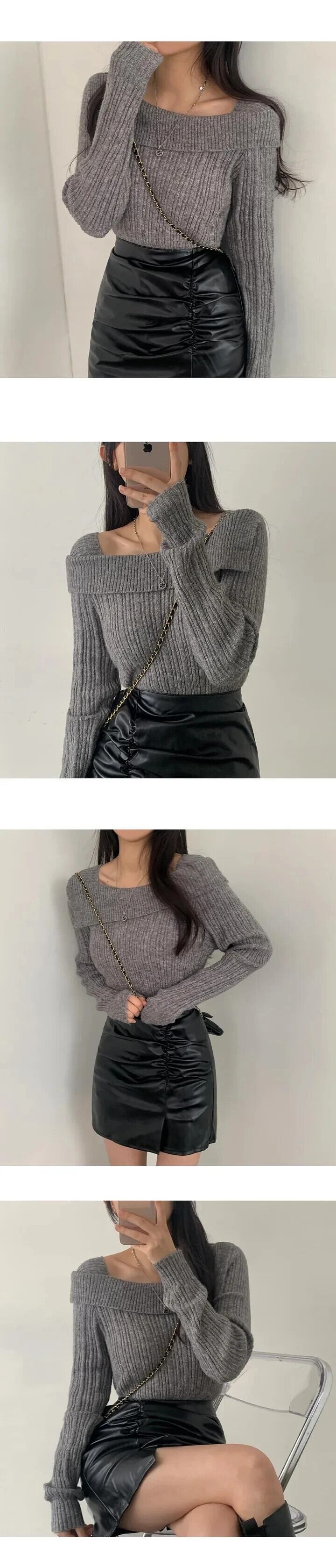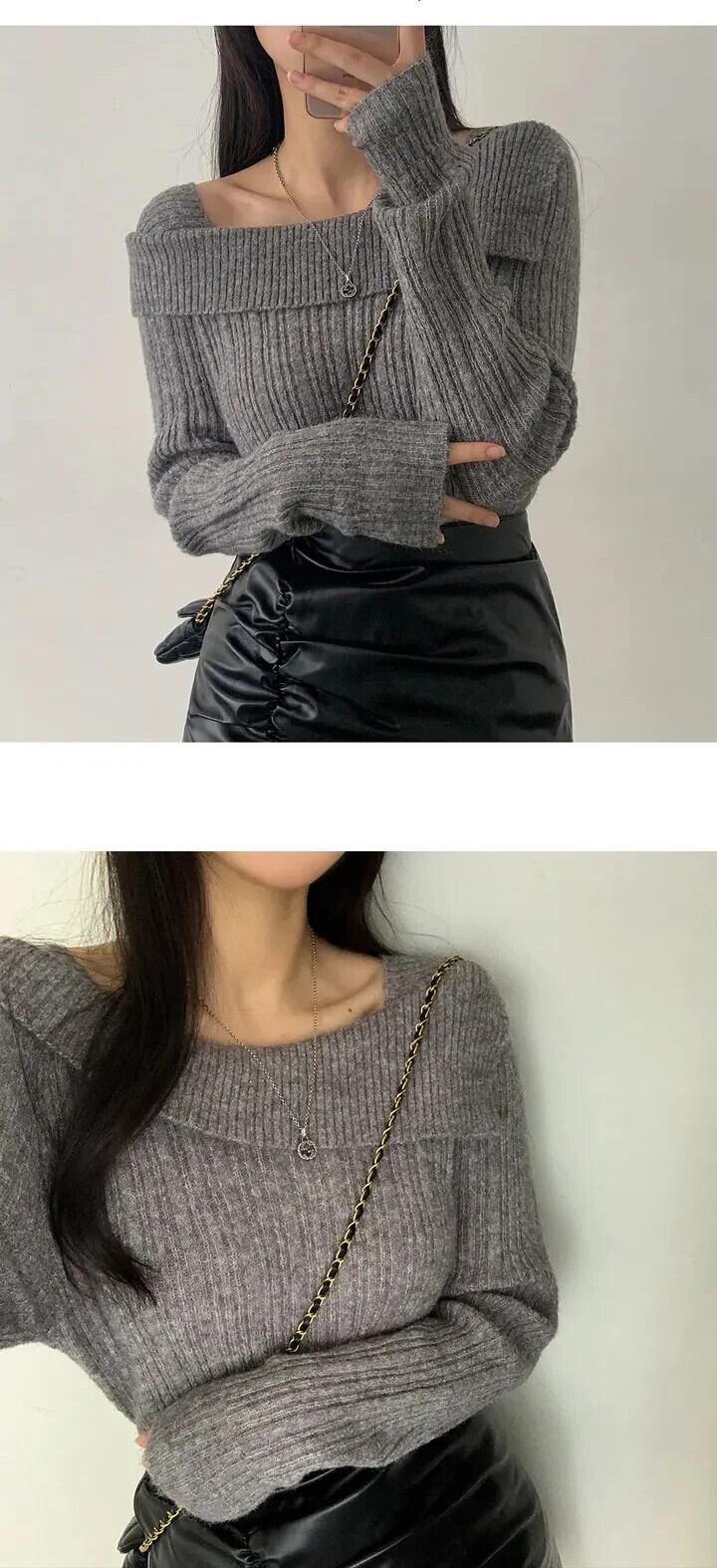ジャージ セーター ワンショルダー ラペル グレー 長袖ニット セーター プルオーバー Y2k トップ セーター デ ジャンパー 2024 スリム ロング