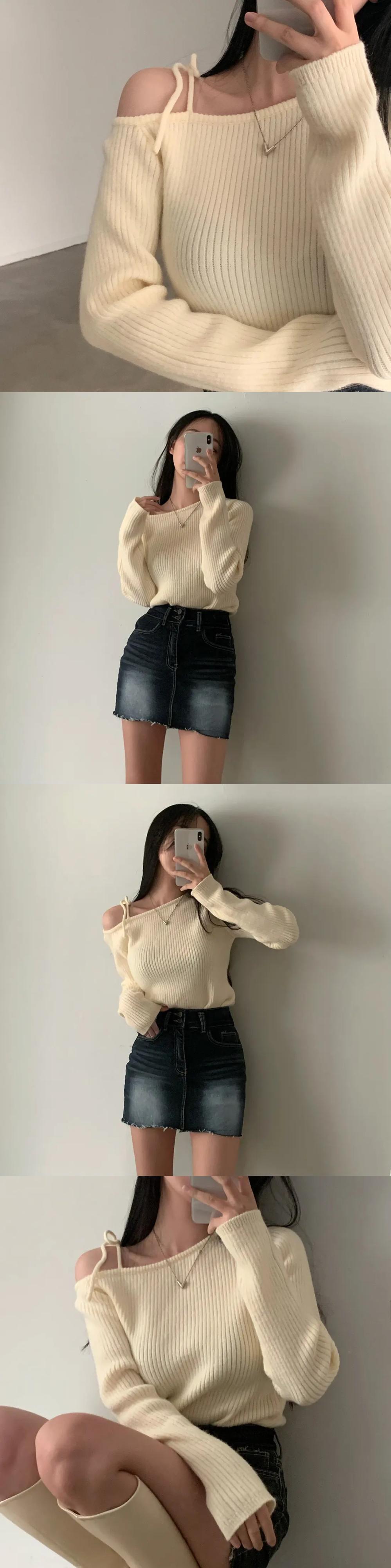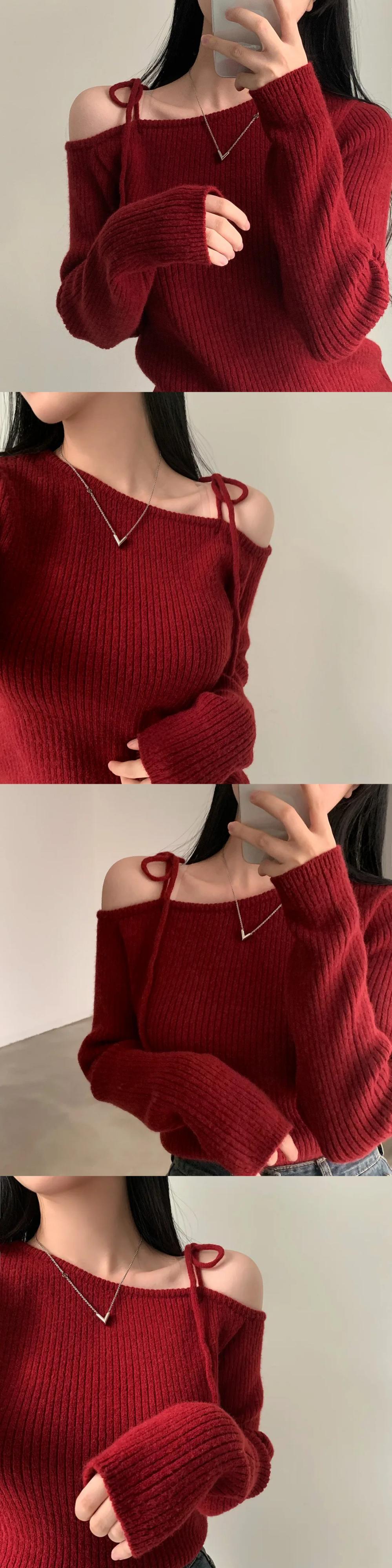 クリスマスレッドレトロ不規則ネックオフショルダーレースアップスリムフィット長袖黒ニットセータープルストラップレストップス ロング ブラック