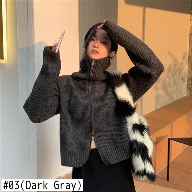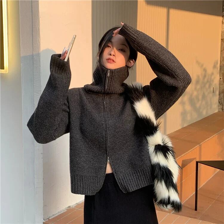 秋ネックジッパーニットセータージャケットシンプルスタイル Y2k ソリッドグレーカーディガンセーター特大トップス 2024 Hotsweet 大人ガーリー スウィート キュート カジュアル オータム 秋物 ソリッドカラー