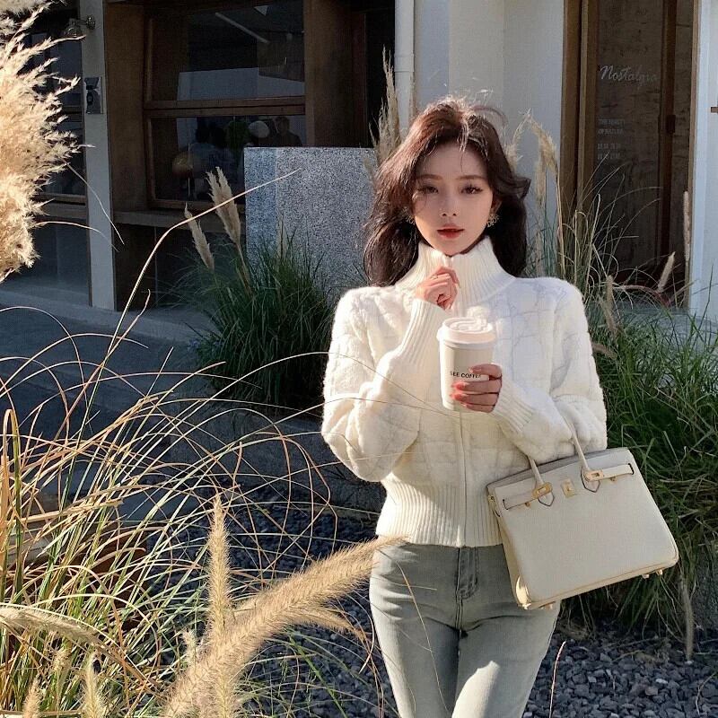 スリム ジッパー セーター シック シンプル Y2k 美的コートすべて一致ニット カーディガン ホワイト タートルネック