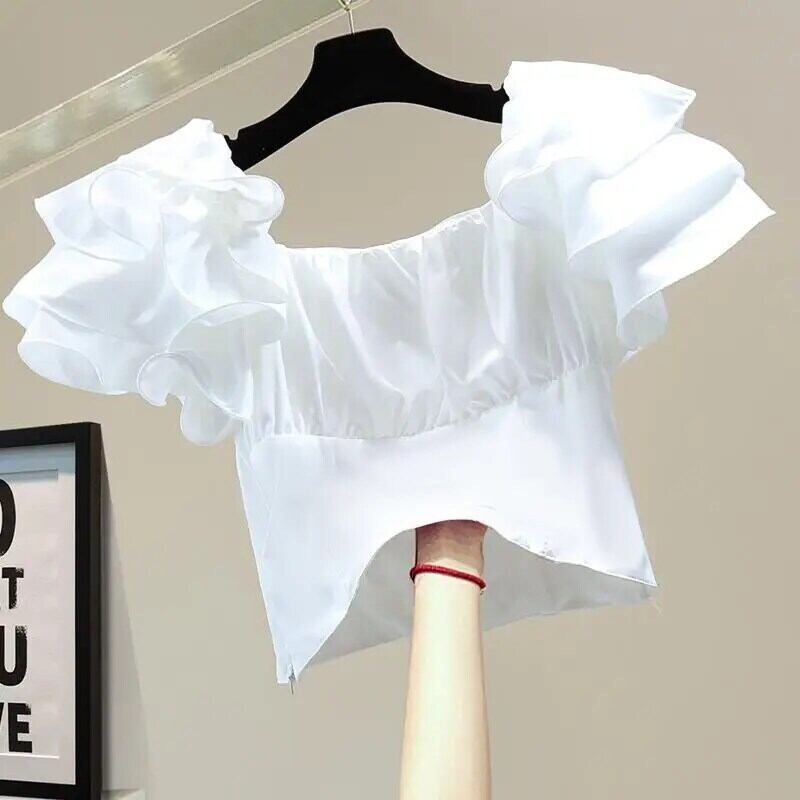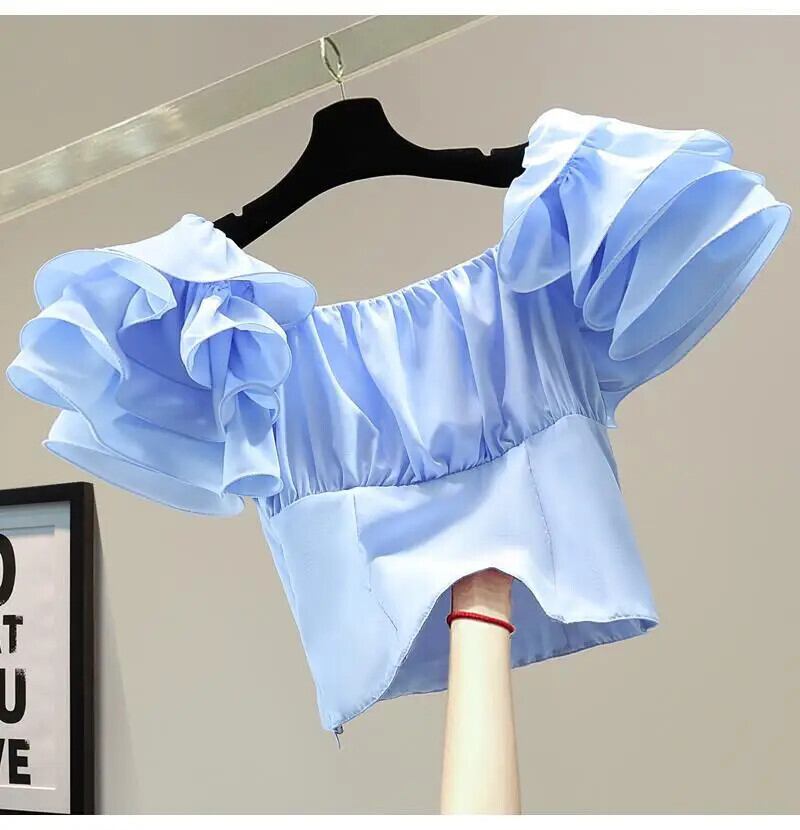 2024 ブラウススリムオフショルダーウエストフリル半袖ソリッドカラーシャツ人形クロップトップ ショート ハーフスリーブ