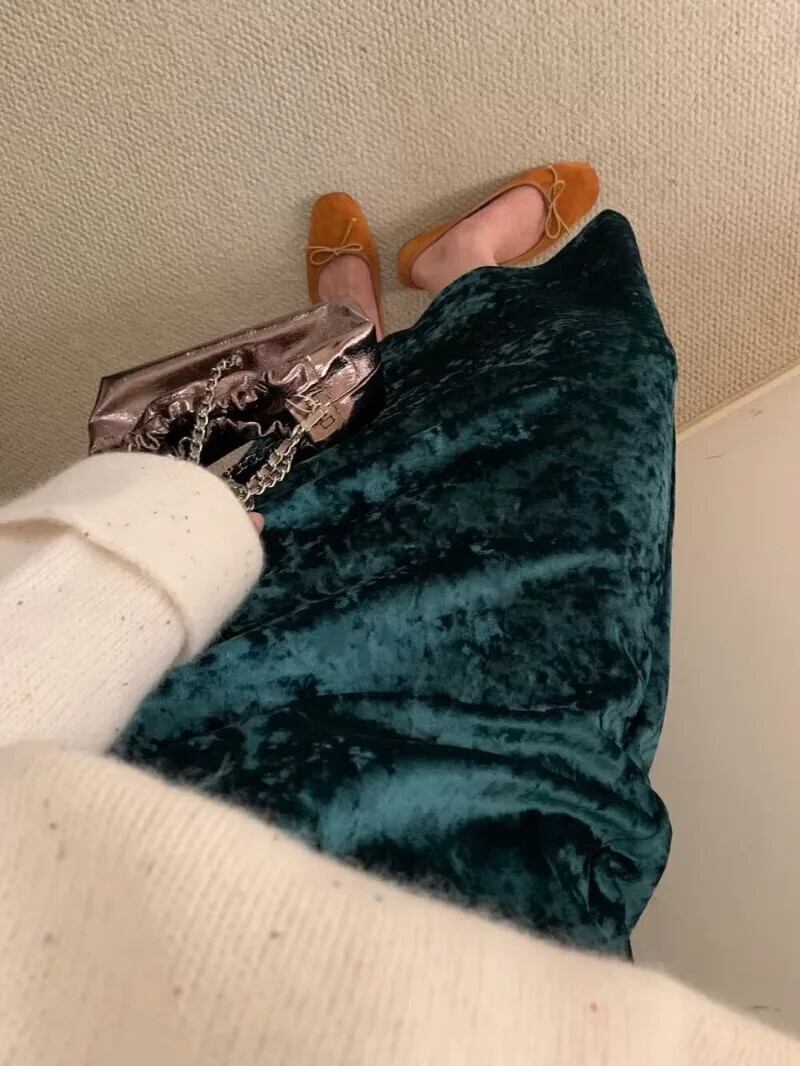 黒スタイルロングスカートスリム段段モーダ 2024 シックベルベット肥厚 Y2k ミディレディ ブラック