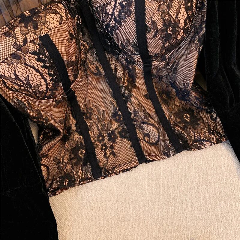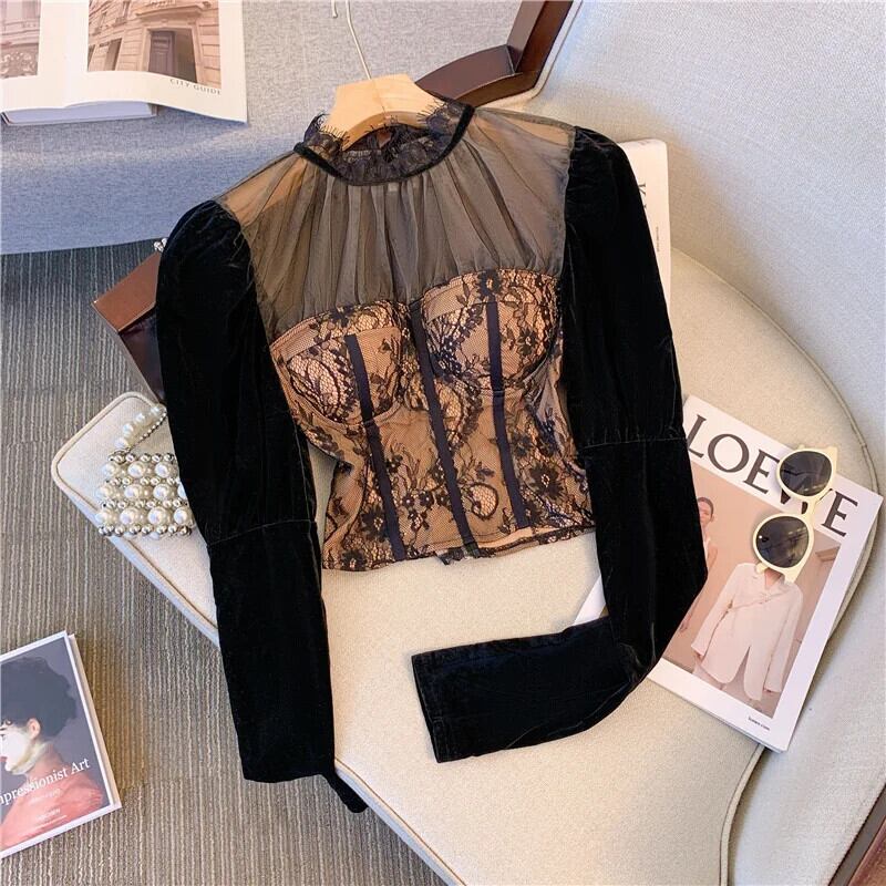 セクシークロップトップデモーダ 2024 スリムブラックベルベットシャツスタンドカラー宮殿スタイルシャツ Y2k ブラウス レース