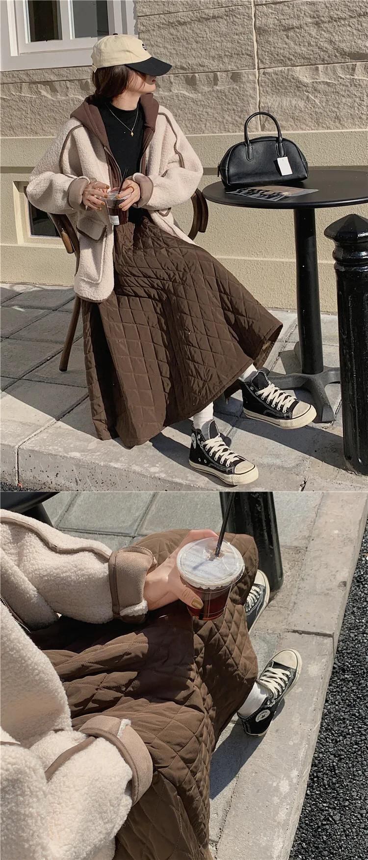 黒厚く暖かい綿パッド入りスカート 2024 秋冬チェック柄 A ラインウエストミディロング ブラック コットン オータム 秋物 ウィンター 冬物 Aライン