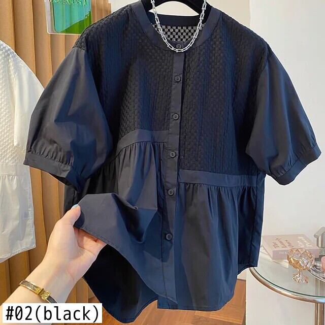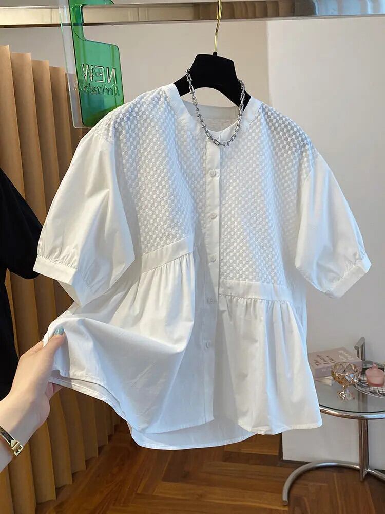 白シャツラウンドネック不規則パッチワーク半袖人形トップス Tシャツブラウスシック ショート ホワイト ハーフスリーブ Oネック