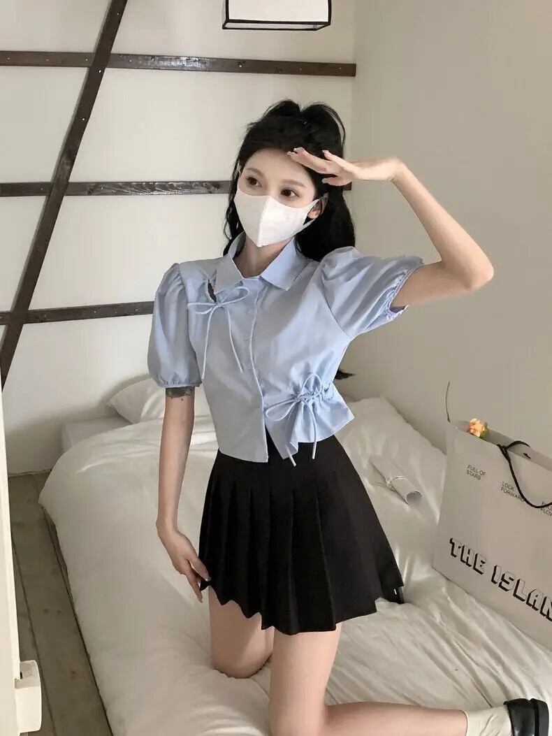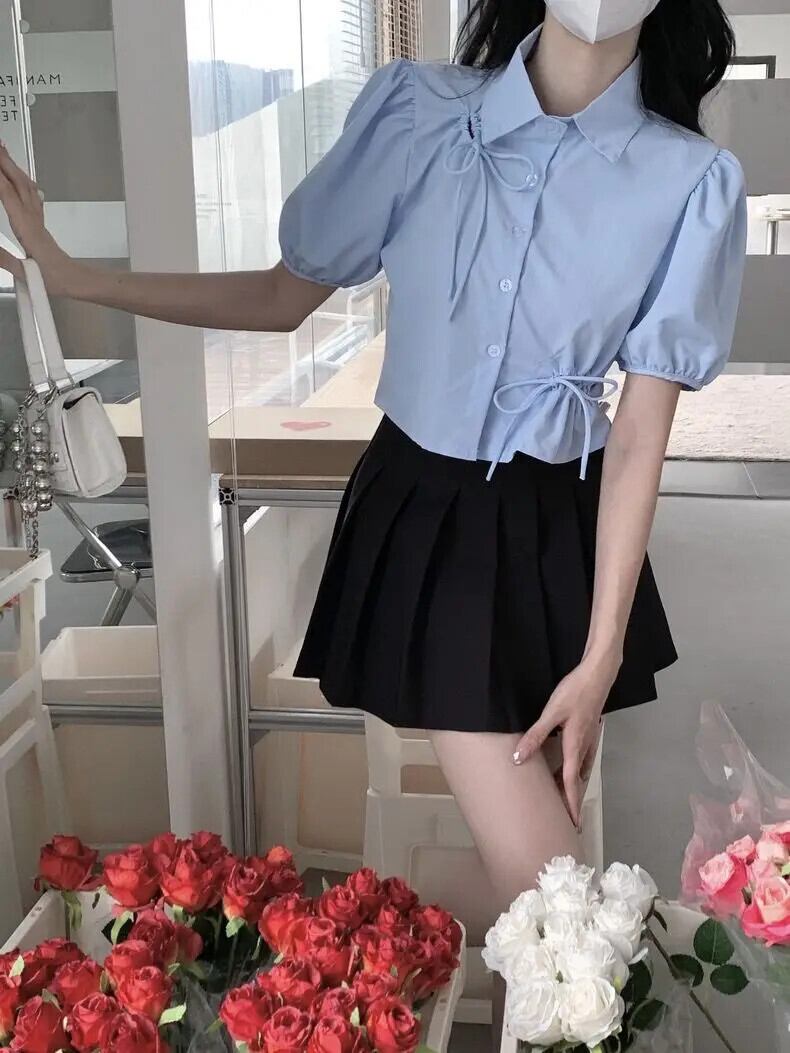 ブルーデパフスリーブチュニックボウブラウスクロップトップスアウトひだサマーシャツシックブラウス リボン 夏物