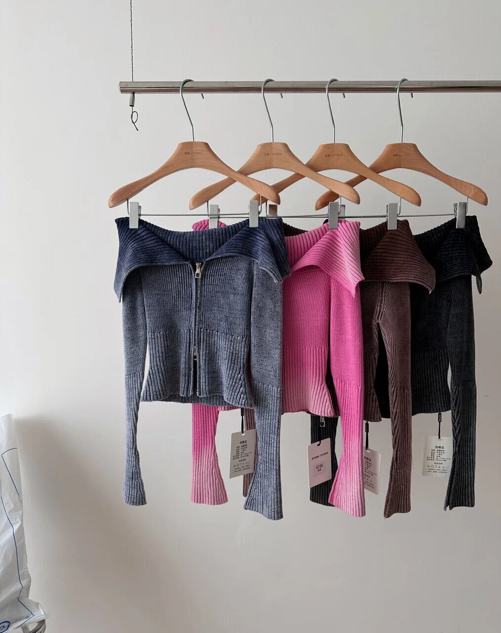 レトロワンショルダースリムフィットネックニット秋オフセクシー気質ジッパーカーディガンニットクロップドセータートップス オータム 秋物
