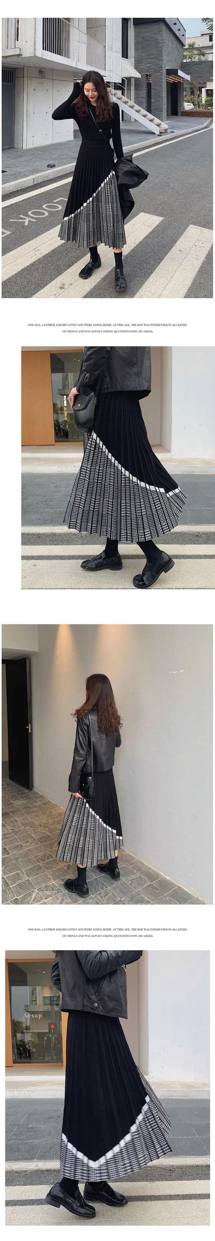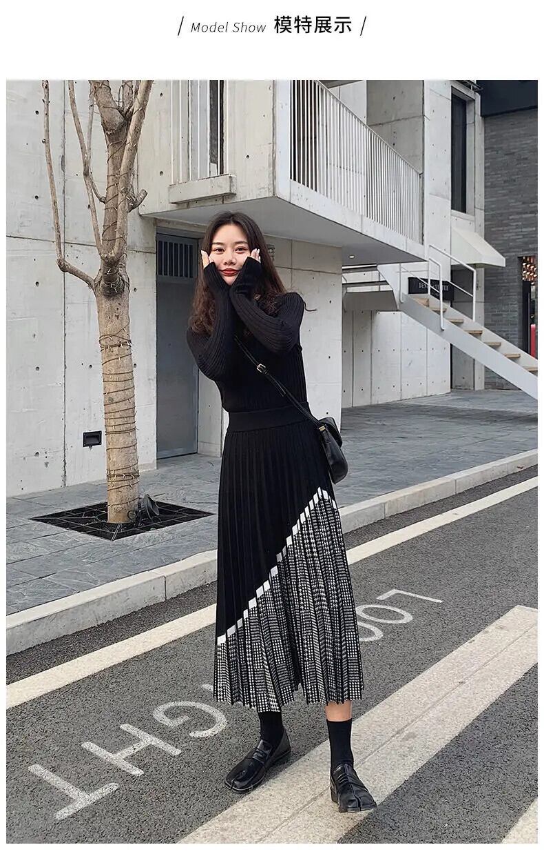 2024 冬千鳥格子ミディスカートウエストプリーツニット厚い黒暖かいスカート段 Faldas ブラック ウィンター 冬物