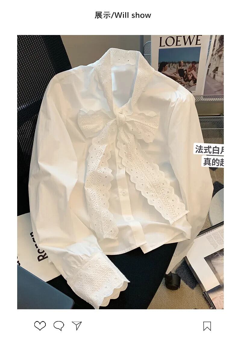 ホワイトパッチワークレースボウ V ネックシャツデモーダ 2024 Verano es 夏フレンチスタイル気質ブラウストップス リボン サマー 夏物 Vネック