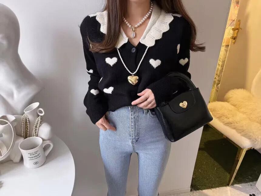 ラペルコントラストカラーシングルブレストルーズ長袖ラブニットセーター甘いジャカードクロップドカーディガンコート人形 ロング 大人ガーリー スウィート キュート カジュアル