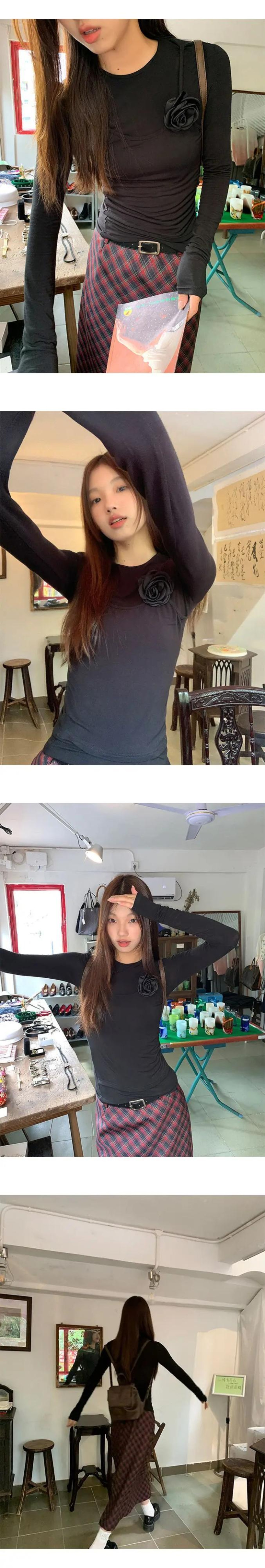 ショルダーショートフェイクツーピース長袖 Tシャツレトロローズトップ原宿美的作物グラフィック Tシャツ Tシャツ ロング かわいい