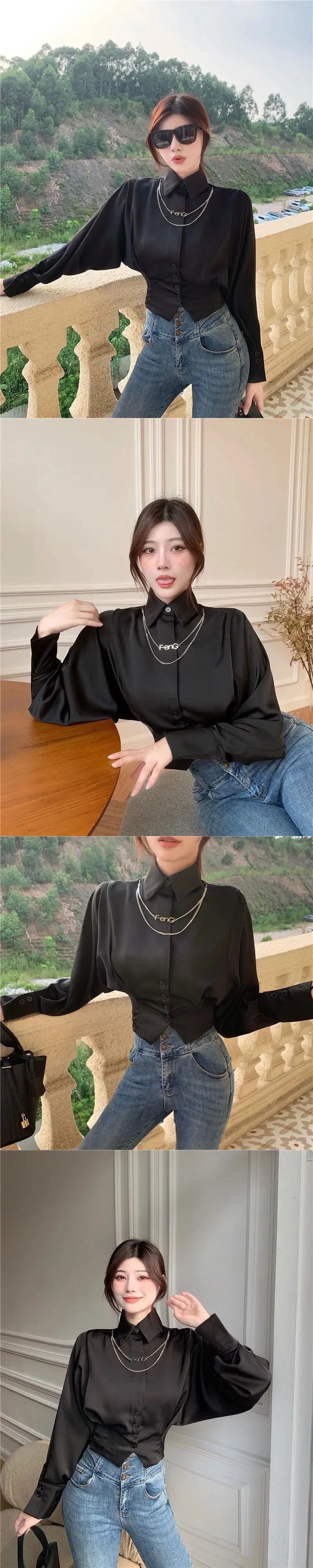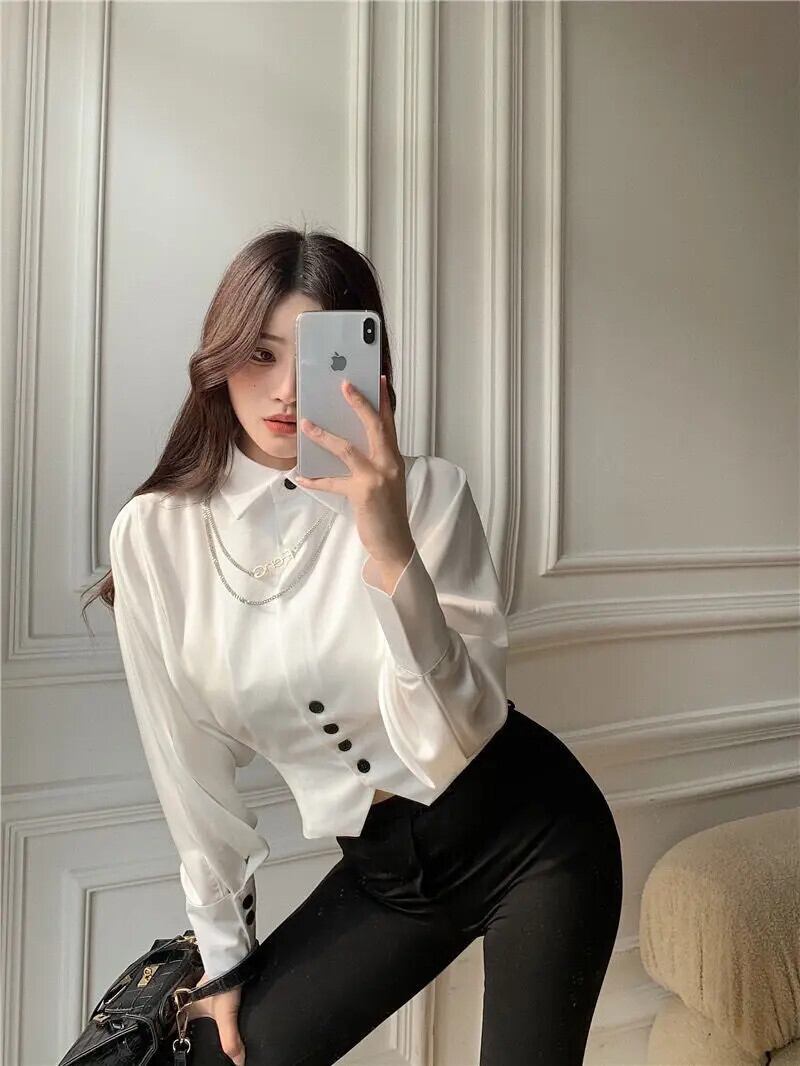 ブラウストップス 2024 Ropa チュニックシャツシック白ターンダウン襟長袖シャツ ロング ホワイト