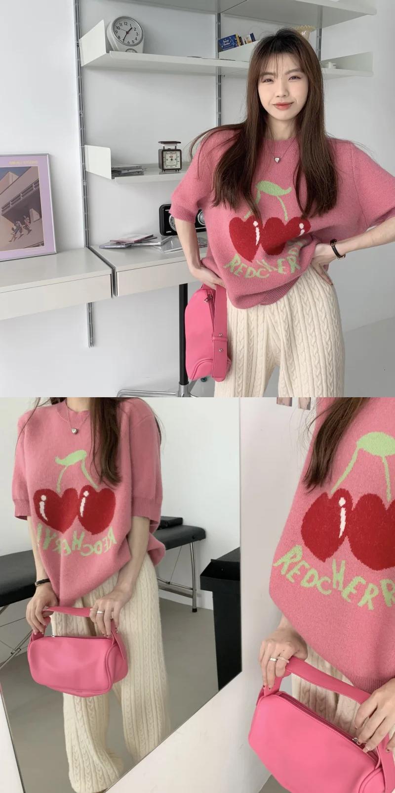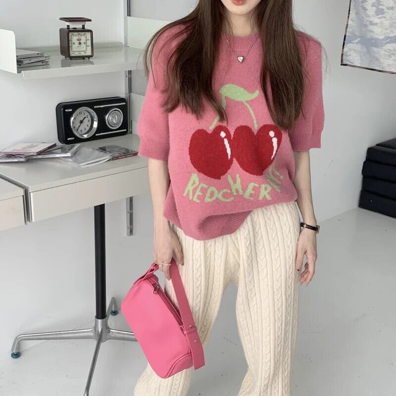 ピンク半袖ニット セーター スイート ジャカード セーター デ チェリー ガール ジャンパー オーバーサイズ セーター Y2k トップ プル ブラック ショート ハーフスリーブ 大人ガーリー スウィート キュート カジュアル
