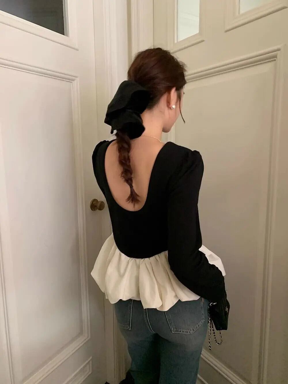 セクシー背中開いたシャツ長袖フリルパッチワークコントラストスリム 2024 秋冬トップ黒 Tシャツ ロング ブラック オータム 秋物 ウィンター 冬物