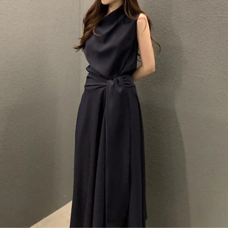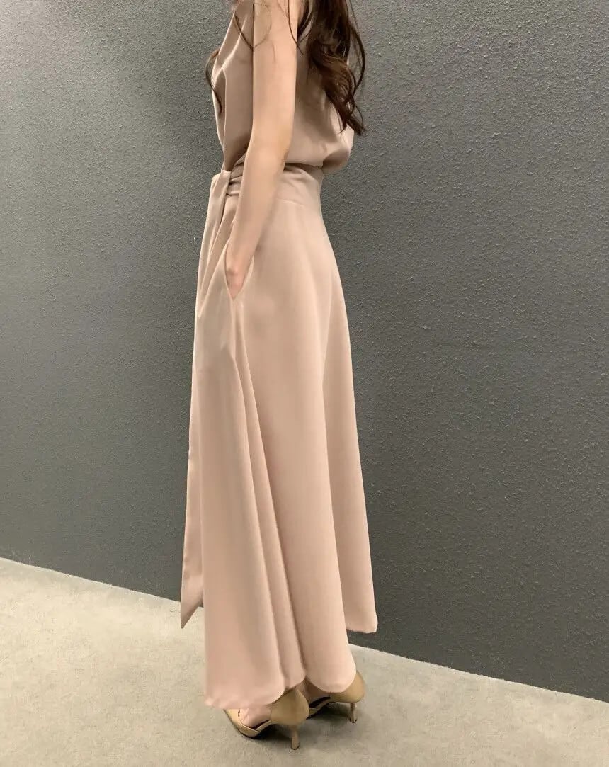 気質スリムパイルアップ襟ネクタイウエストノースリーブピンクベストドレス Vestidos デ 2024 春パーティーウエディング スプリング 春物