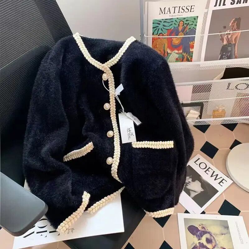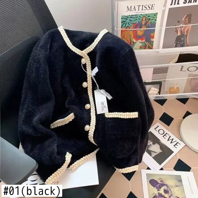 O ネック シングルブレスト パール ボタン ポケット ニット セーター ルーズ ヒット カラー ミンク ベルベット カーディガン Oネック 真珠