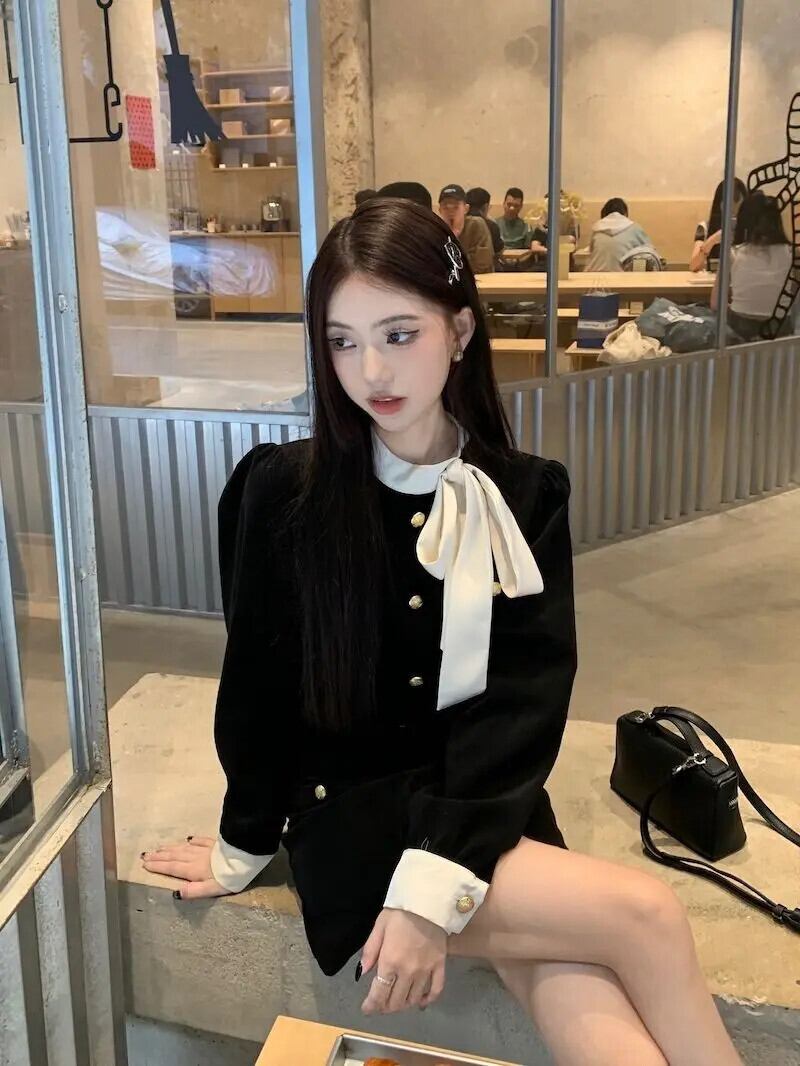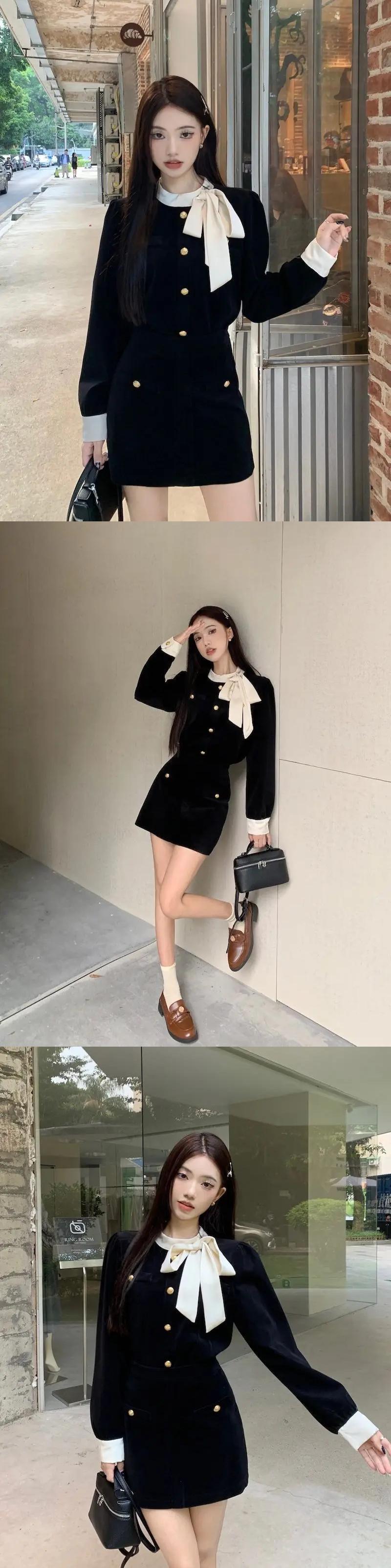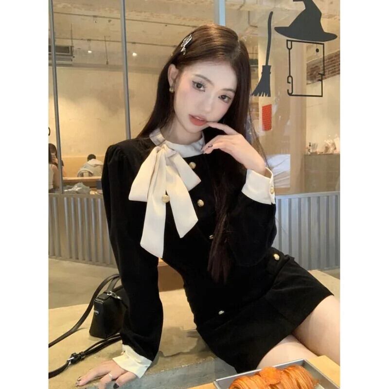 2 個セットレディース衣装小さ香り弓ベルベット長袖トップウエストスカートスーツ黒 2024 スリム Y2k ジャケット ロング ブラック リボン