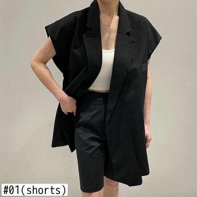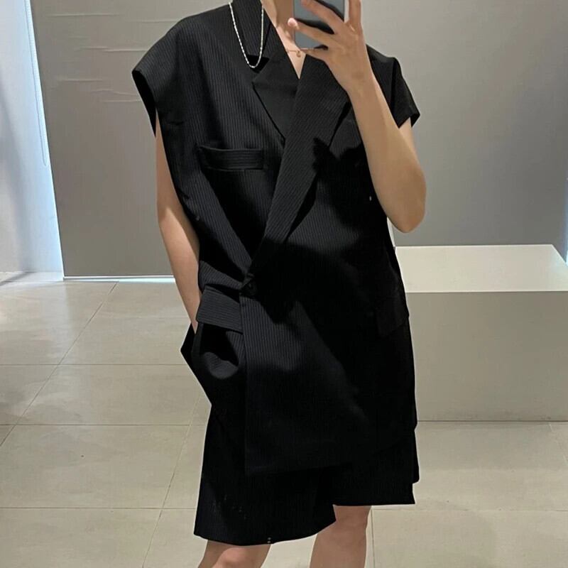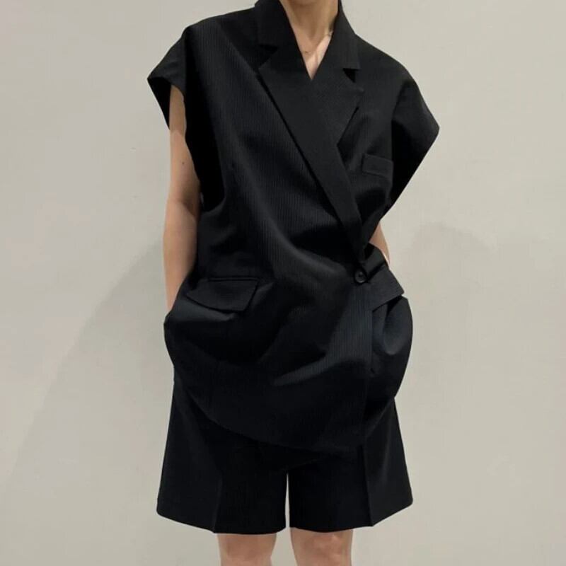 レトロラペルノースリーブスーツジャケット 2024 夏黒ブレザートップスウエストスリムワイドレッグショーツセットレディース衣装 ブラック サマー 夏物 ブルマー ワイドパンツ